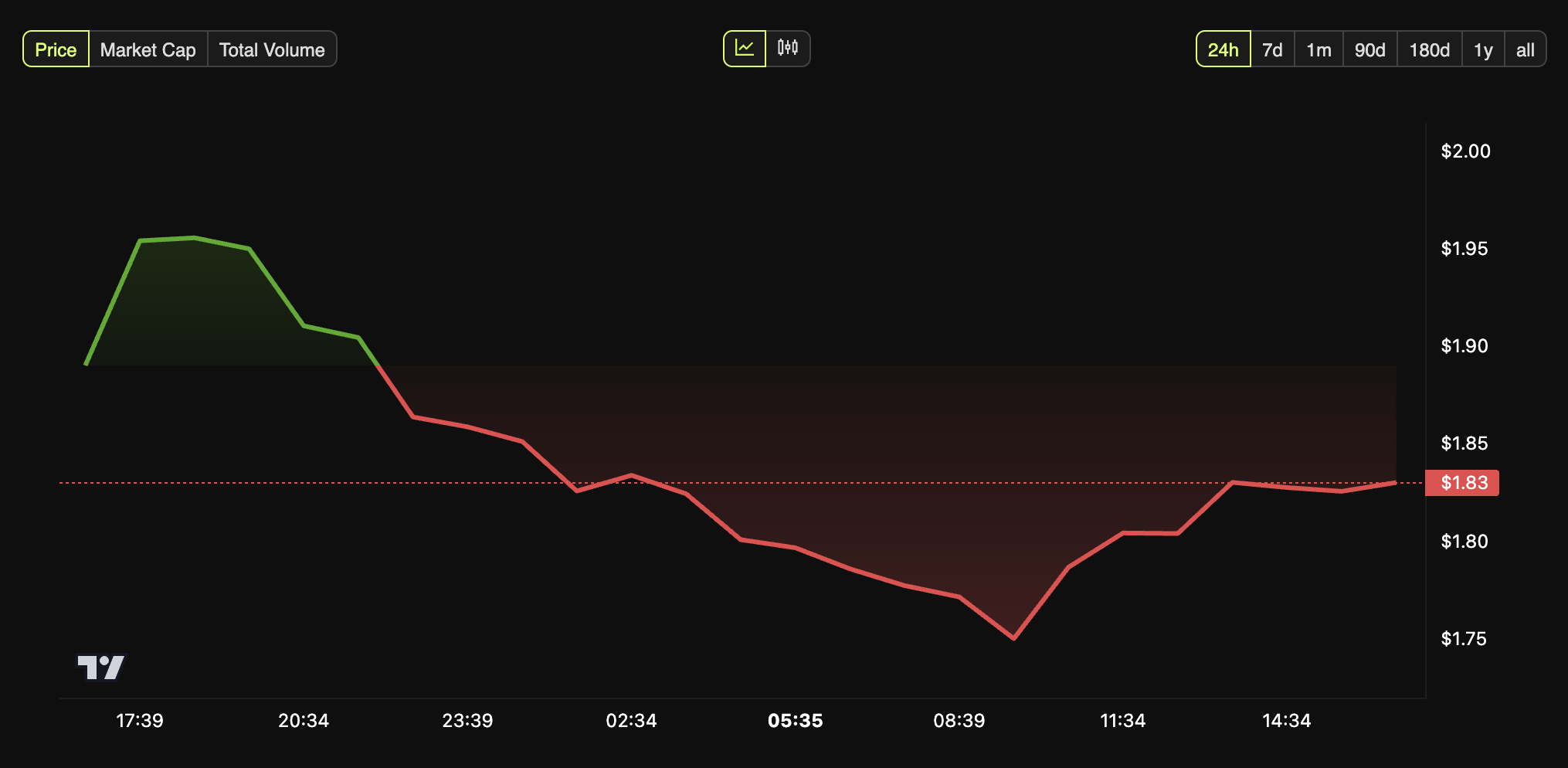 尽管市场普遍乐观,XRP在更广泛的市场崩盘中仍面临困境。过去一天,该代币下跌了2.9%。截至发稿时,其交易价格为1.8美元。