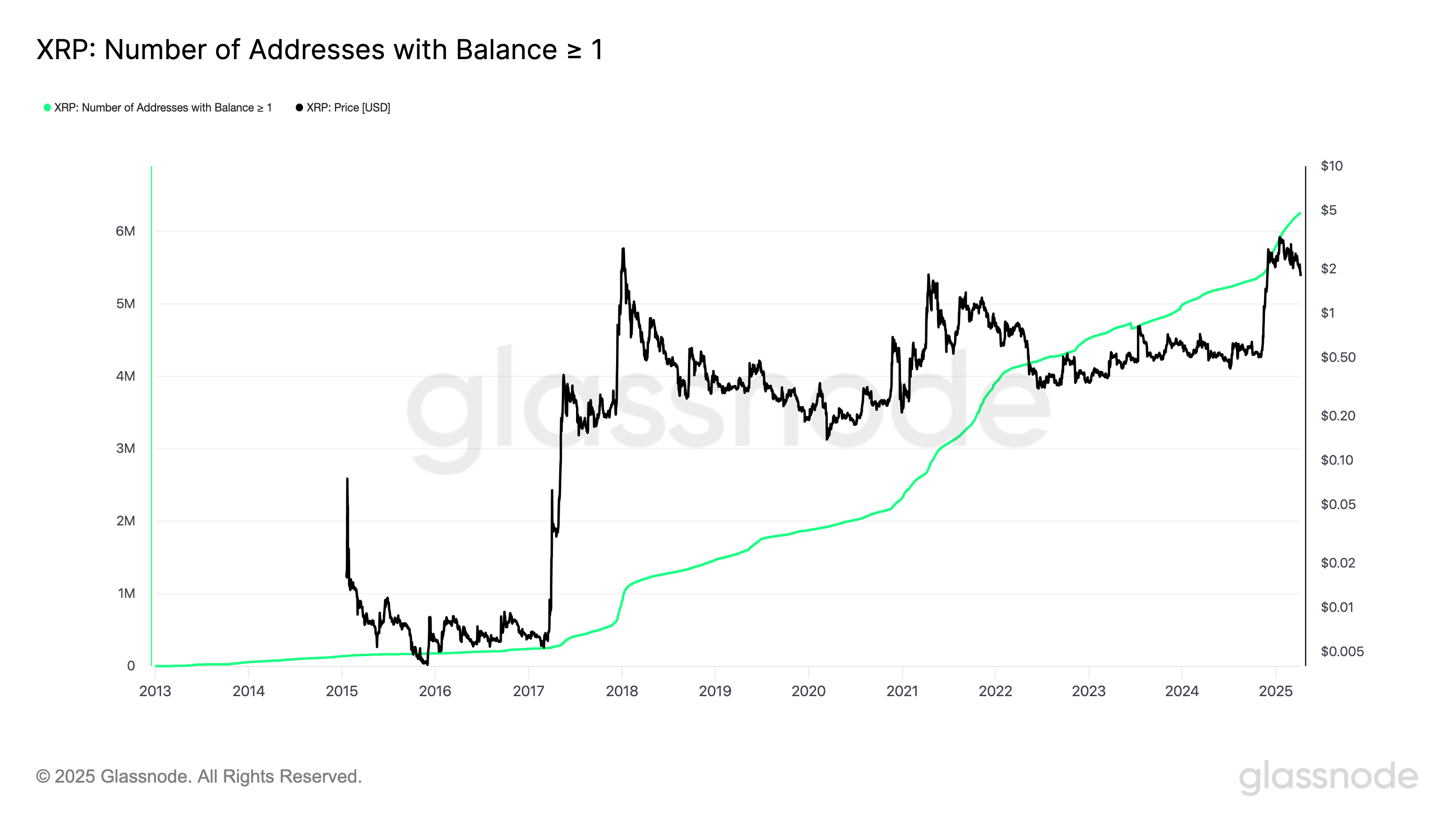 有趣的是,似乎许多人都有相同的信念。尽管最近市场波动,但散户投资者对XRP的兴趣正在上升。根据Glassnode的最新数据,持有1个或更多XRP的地址数量已达到620万的历史新高。