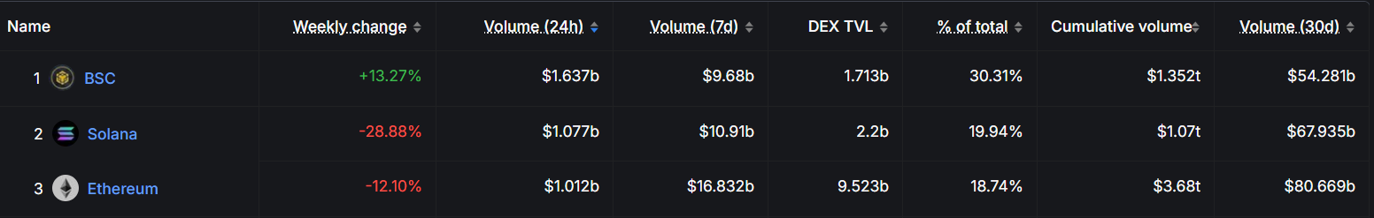 BNB链首次在每日去中心化交易所(DEX)交易量上超越Solana。3月16日,BNB链录得16.4亿美元的交易量,这一增长主要得益于Mubarak(MUBARAK)和TaTaTu(TTU)等Meme币的飙升。与上周相比,BNB链的交易量增长了13%,而Solana同期则下跌了28%。