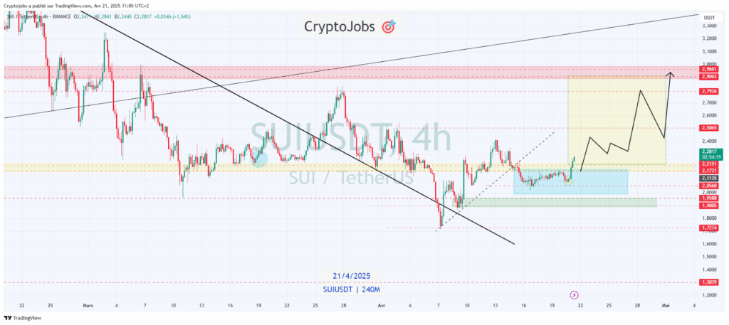 根据4小时SUI/USDT图表,价格突破了自2月以来一直维持的下降趋势线。