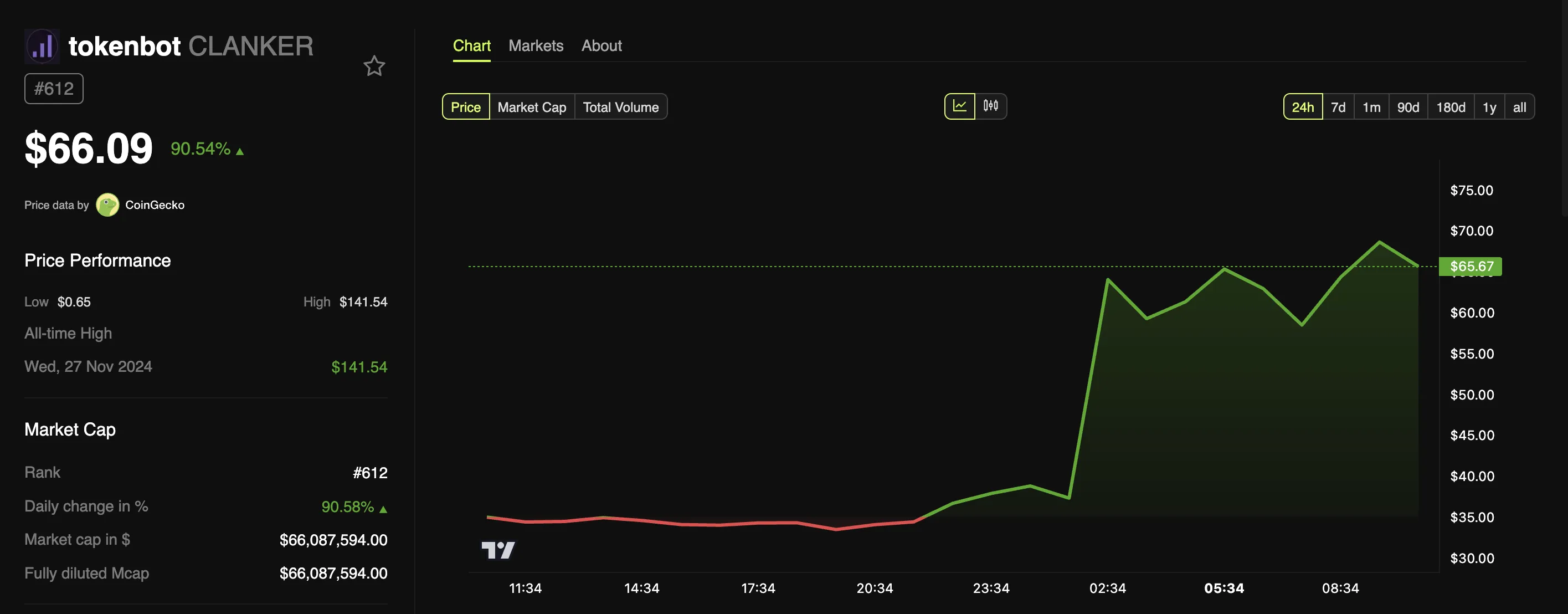 "这些标准不会考虑项目的市值或受欢迎程度,"交易所在博客文章中表示。与此同时,在消息发布前市值仅为3500万美元的CLANKER,在Coinbase宣布后市值飙升至6600万美元。事实上,该代币在过去24小时内涨幅达90%,成为涨幅最大的代币之一。截至发稿时,CLANKER的交易价格为66美元。
