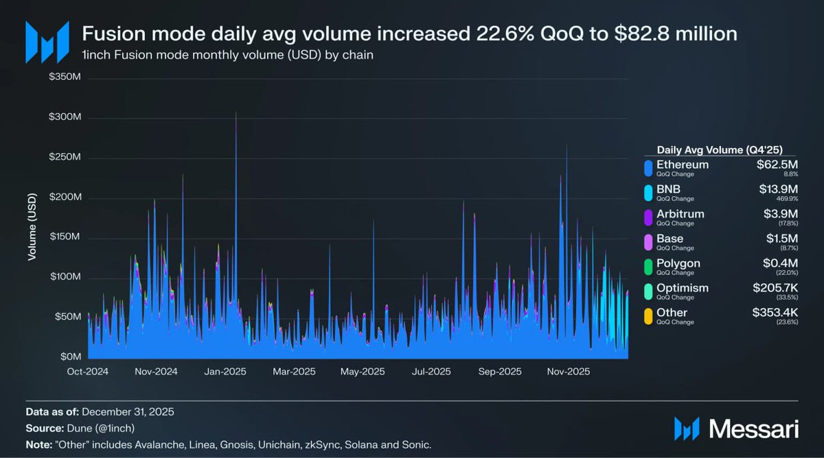 1inch Fusion模式的日均交易量在上个季度达到$82.8 million,环比增长22.6%