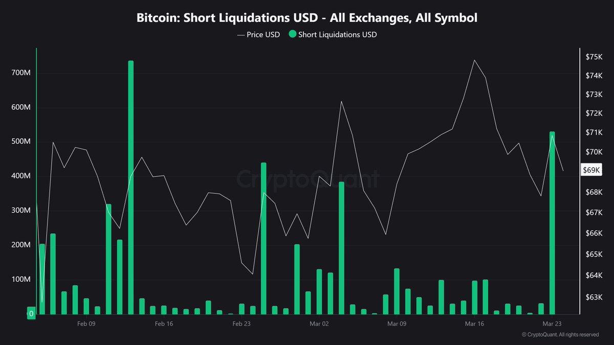 3月23日比特币空头清算总额达5.31亿美元,创下自2月13日以来的最高单日清算总额