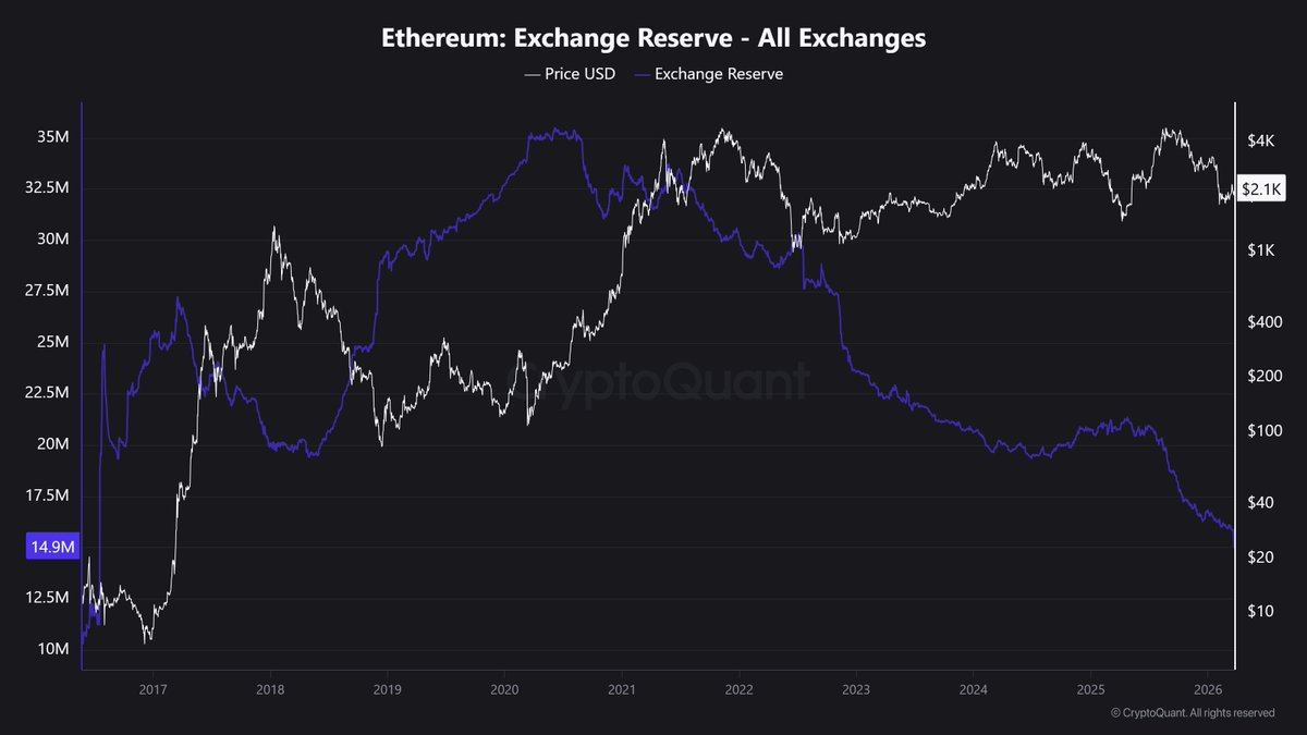 截至今日,CEX上的以太坊储备已降至1500万$ETH以下,创下自2016年7月以来的最低水平