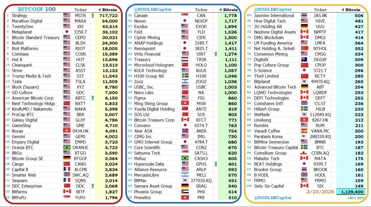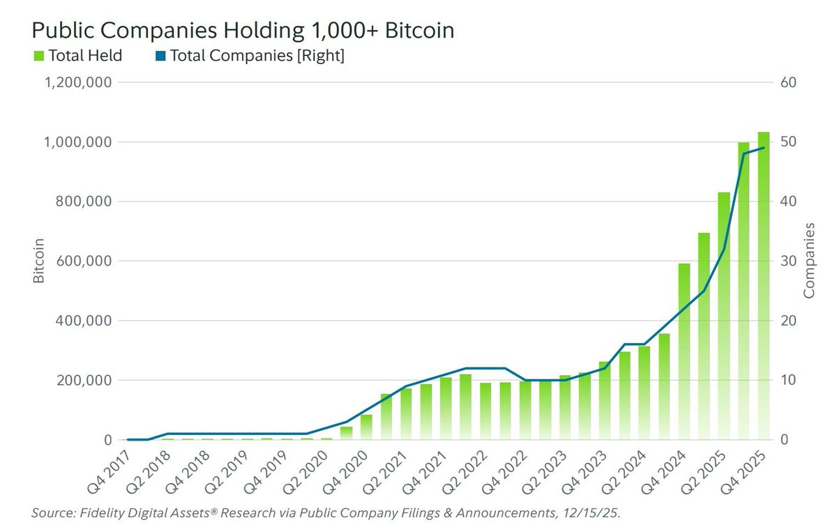 2025年上市公司资产负债表中的比特币数量显著增加。2017年第四季度开始积累,到2024年底,22家公司持有1000或更多的$BTC。到2025年底,这一数字增加了一倍多,达到49家。