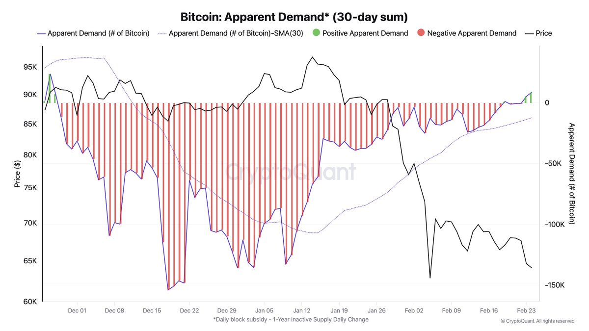 据CryptoQuant称,比特币现货需求自11月底以来首次上升