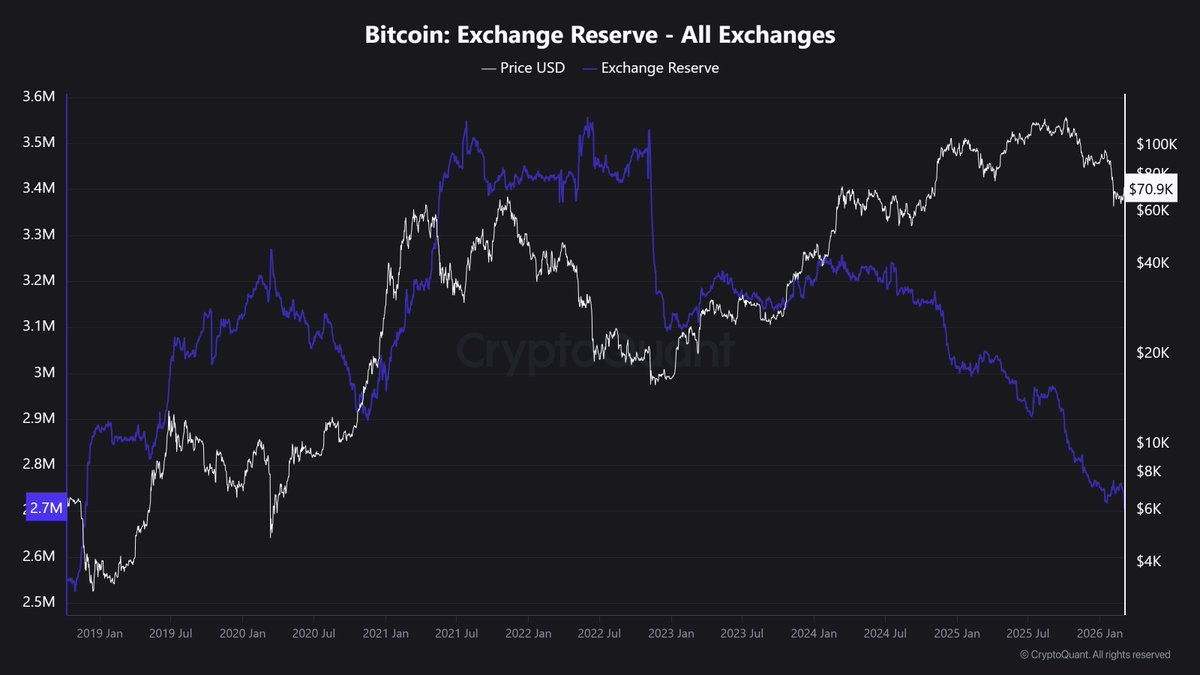CEXs中的比特币储备今天跌至2,708,000 $BTC以下,为2018年11月以来的最低水平
