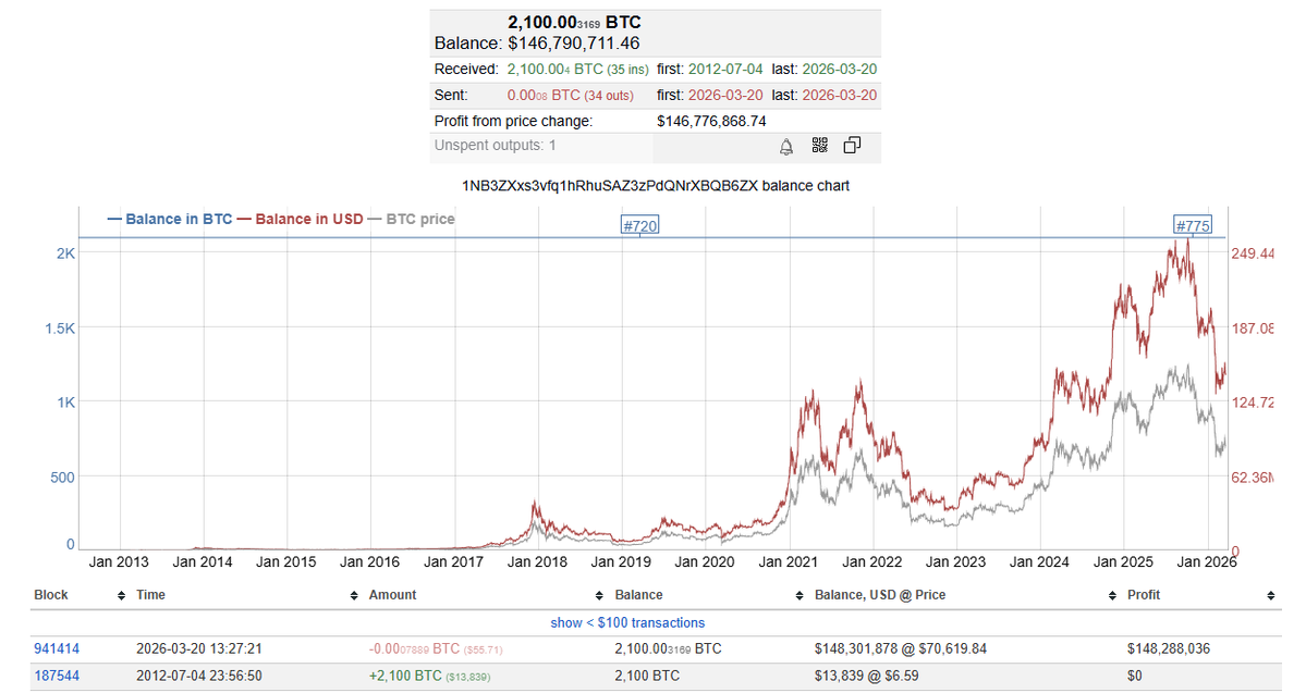 一个 $BTC 鲸鱼地址在沉寂13.7年后今天再次活跃:该鲸鱼持有2100 BTC,今天转移了0.0007889 BTC