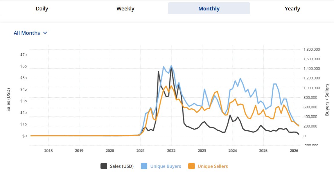 3月,NFT销售额总计$105.9 million,创下自2021年以来的最低月度销售额,据CryptoSlam称