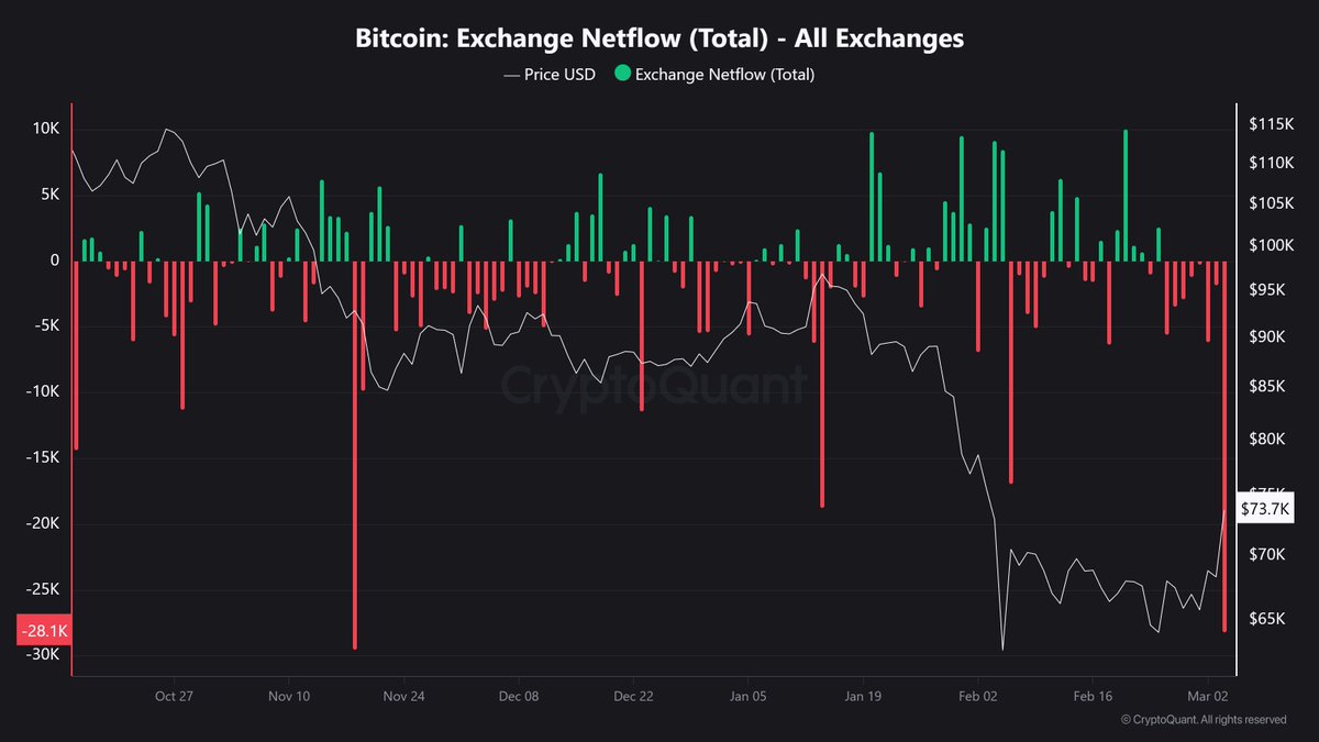 28,195 $BTC 今天从CEXs净流出,这是自2025年11月以来的最高单日净流出记录