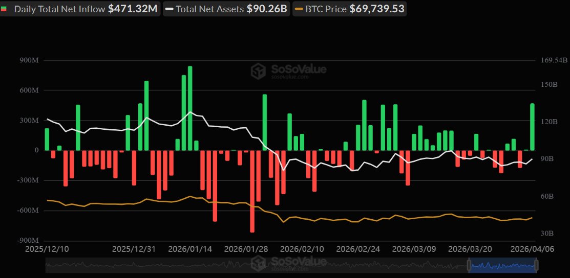 比特币现货ETF在4月6日录得4.713亿美元净流入,为自2月25日以来的最高单日净流入额$BTC
