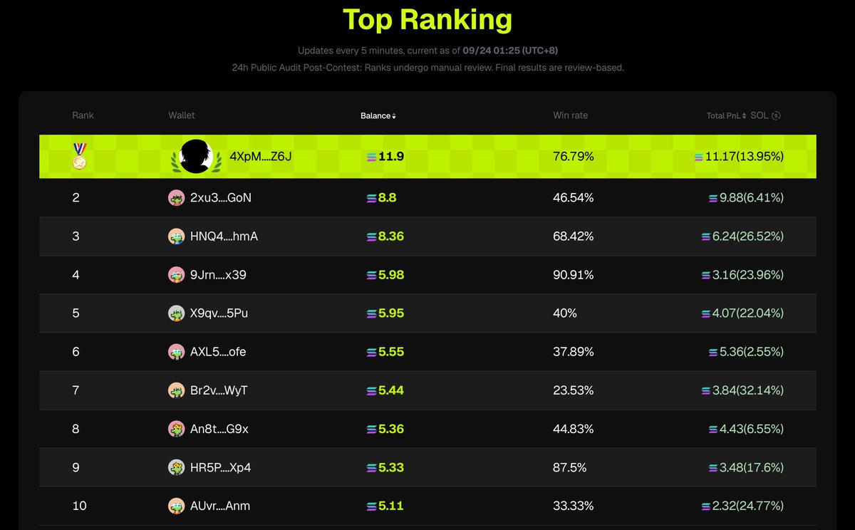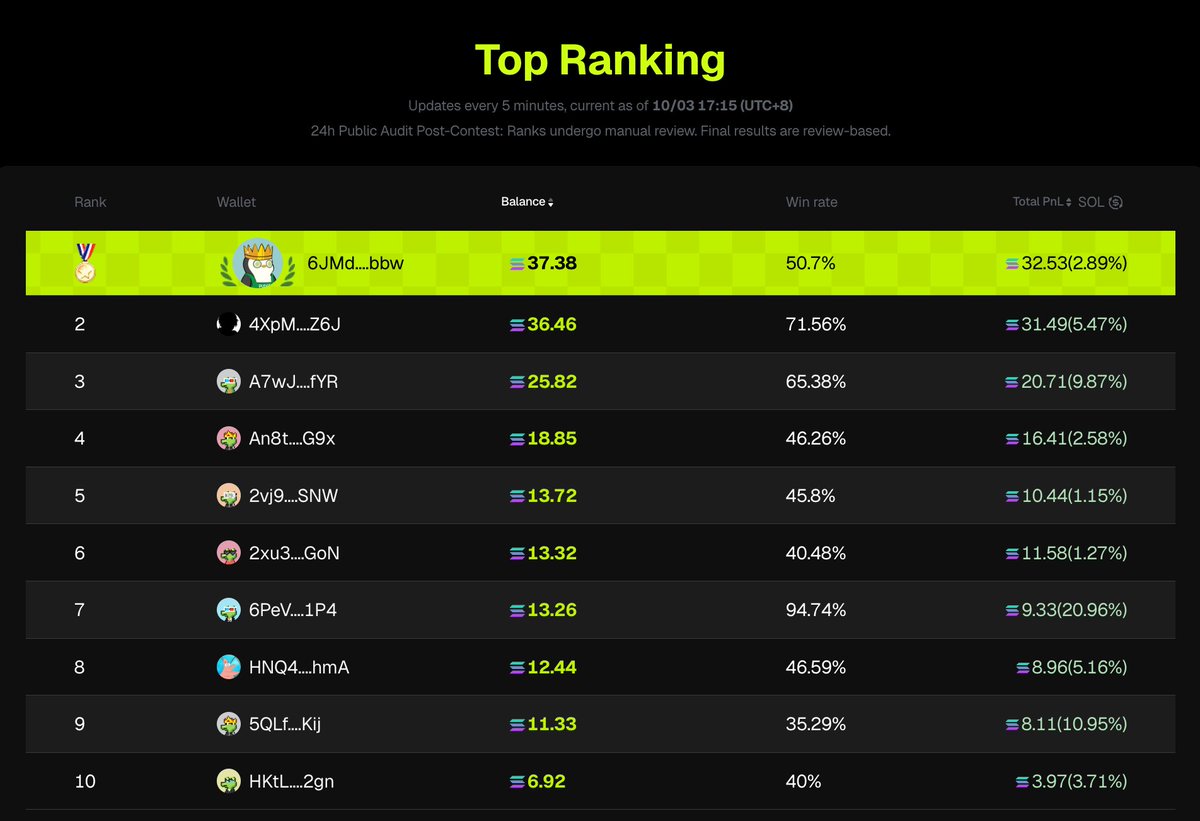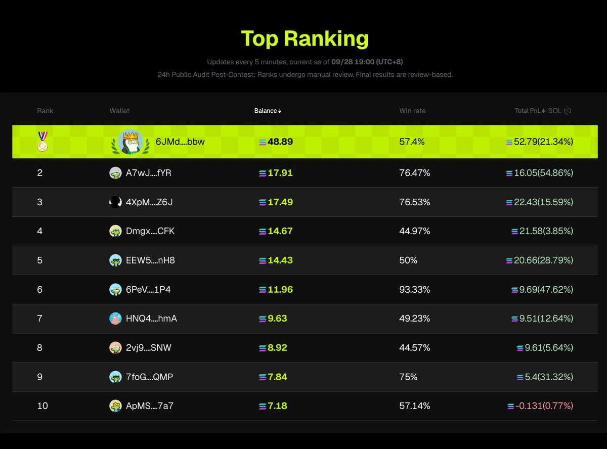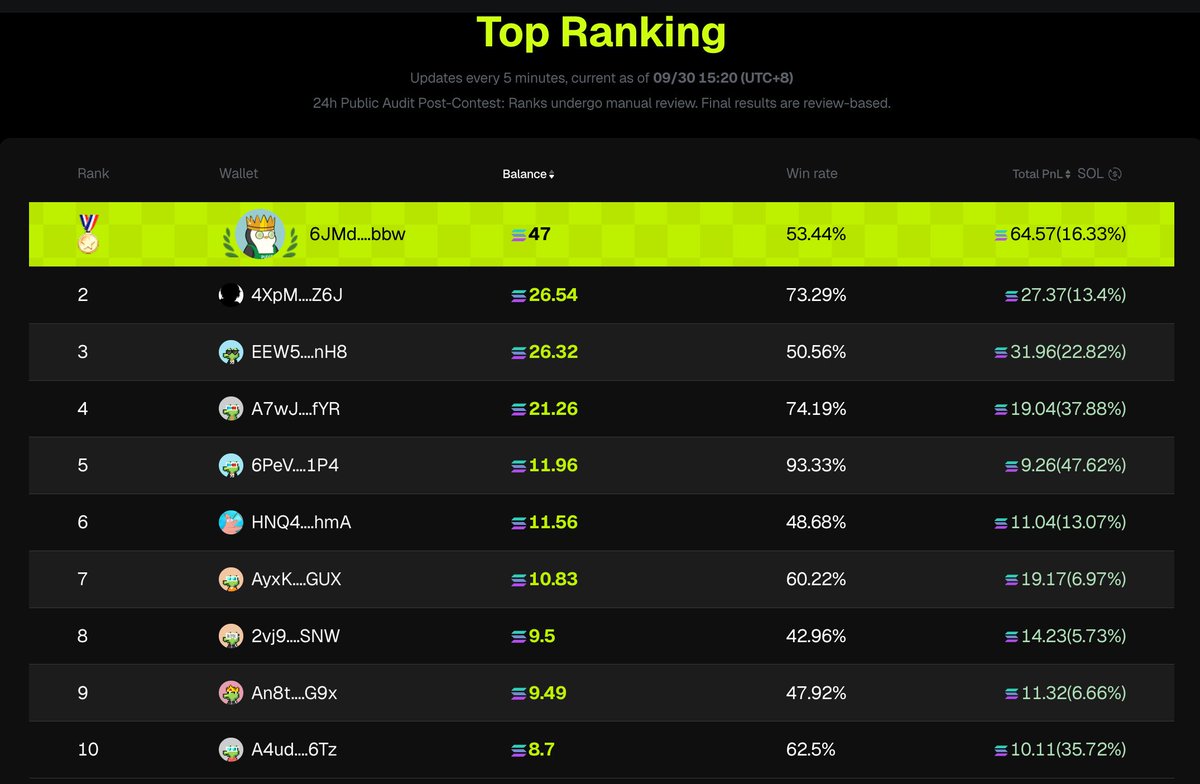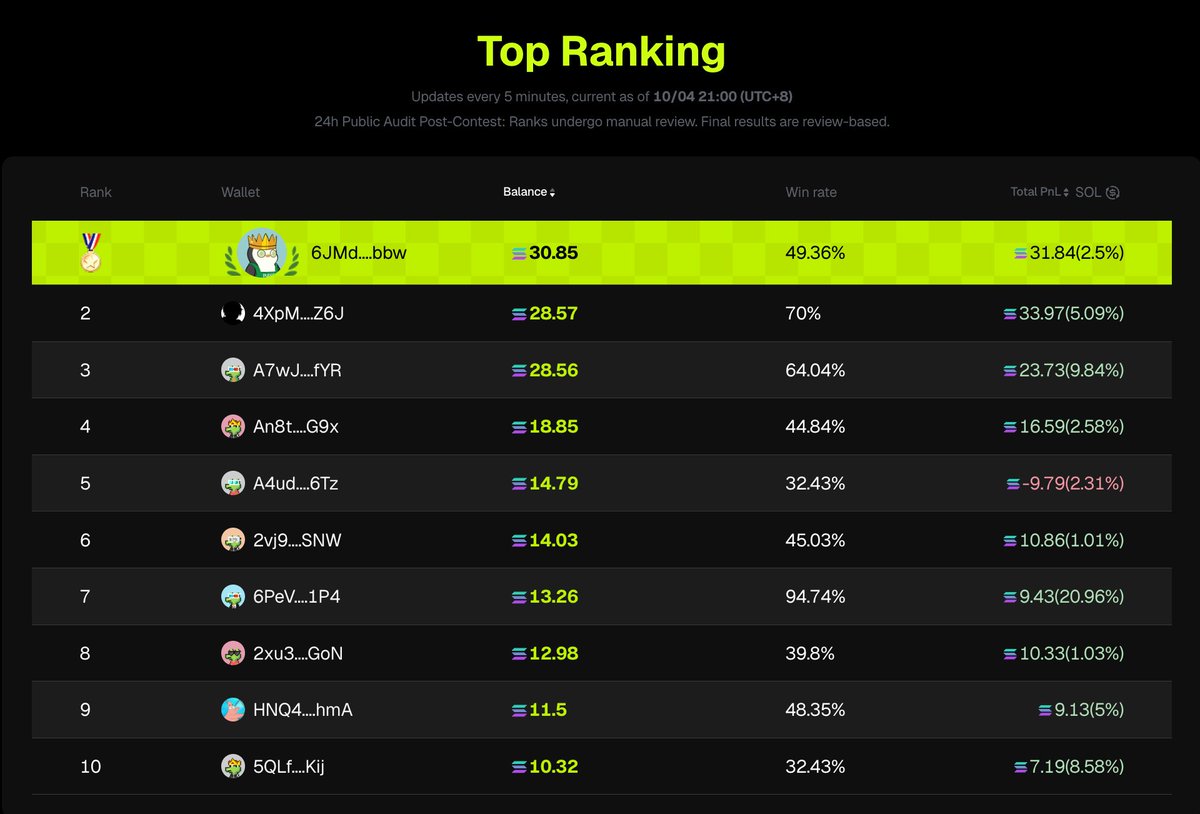 🏆 第一名: 6JMd....bbw Bal. 30.85 SOL x10