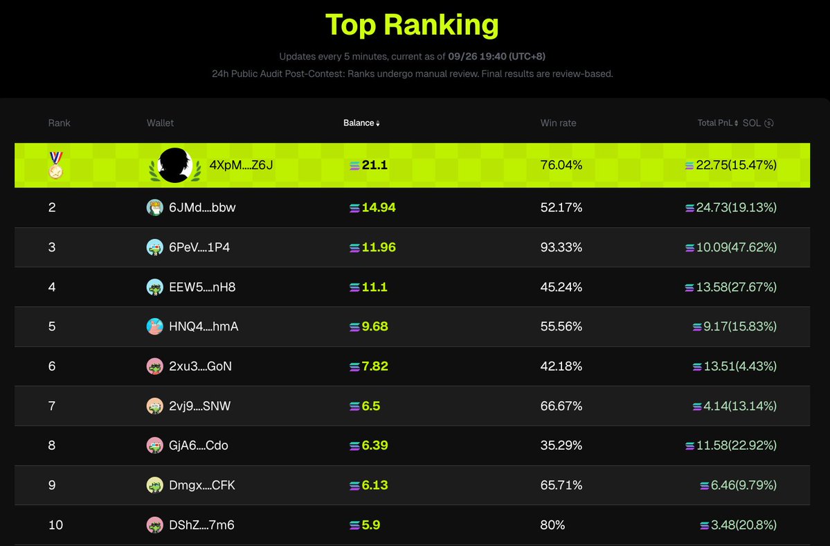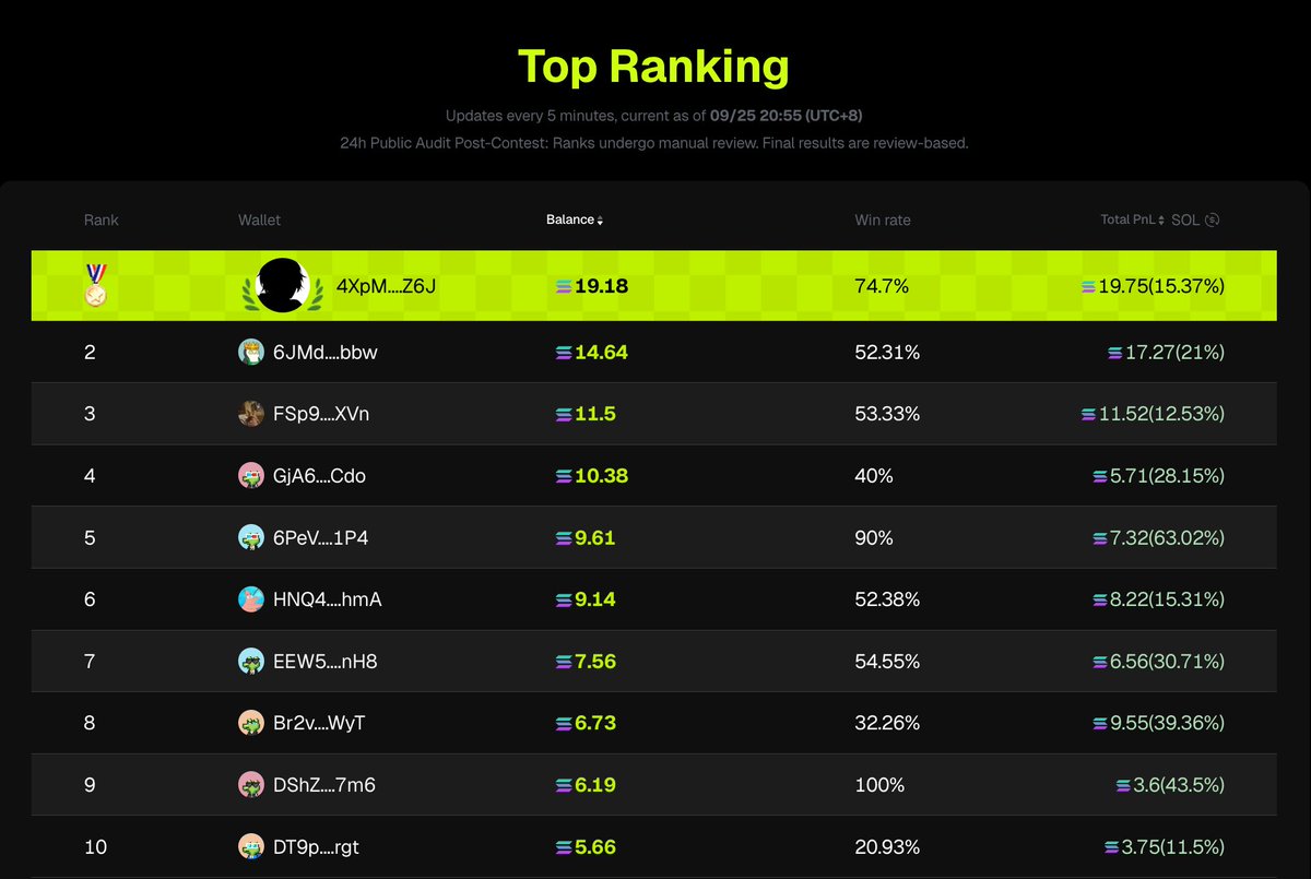 🏆 第一名: 4XpM....Z6J Bal. 19.18 SOL
