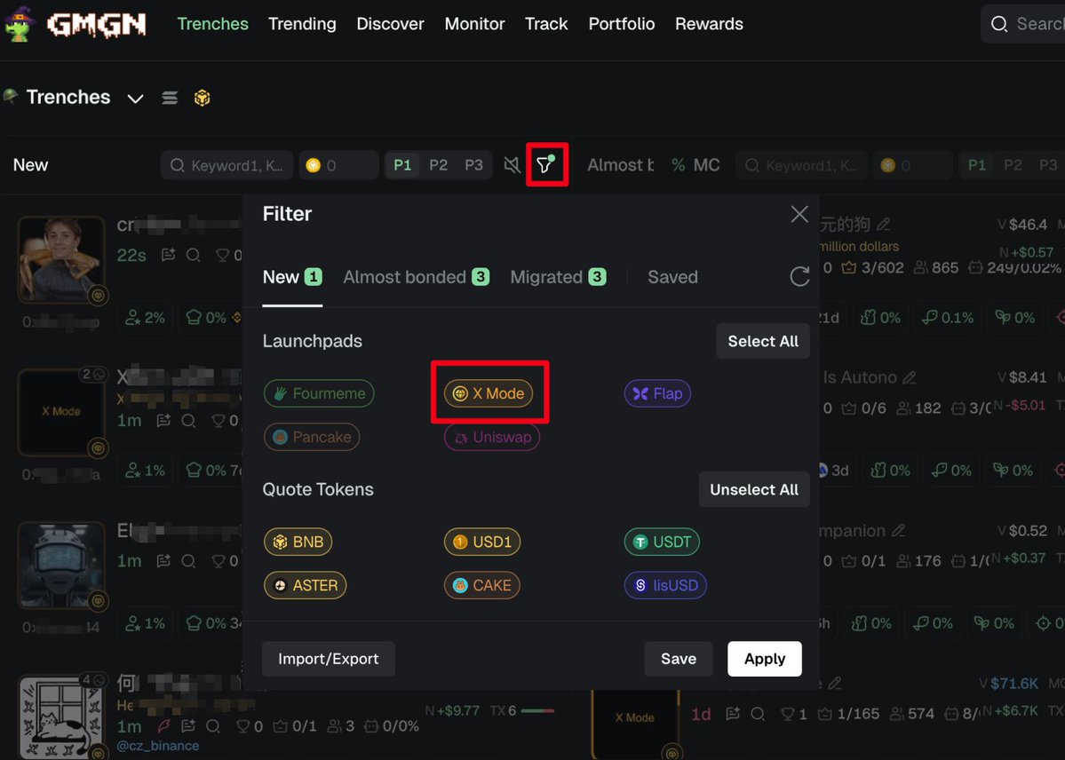 - X Mode默认在Trenches过滤器中启用,实时更新税务信息。直接在Trench-New购买,抓住你的1000倍潜力币!