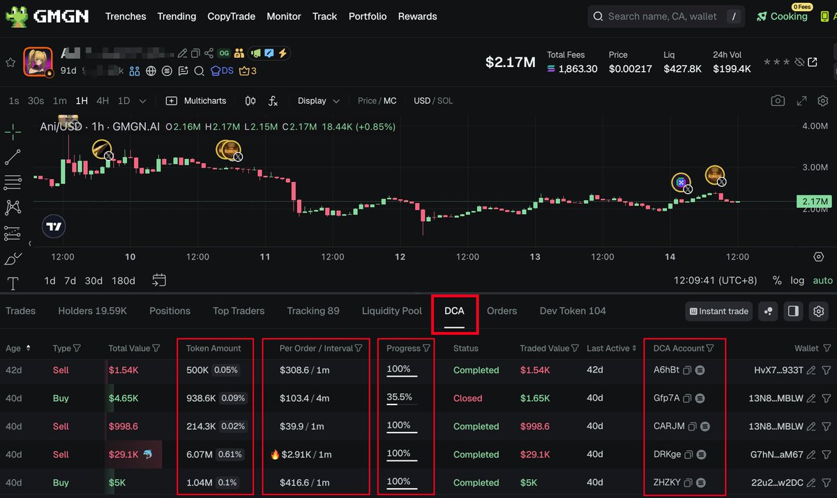 - 跟踪 DCA 订单的买入/卖出频率和持有代币钱包的金额,检测鲸鱼批量买卖信号