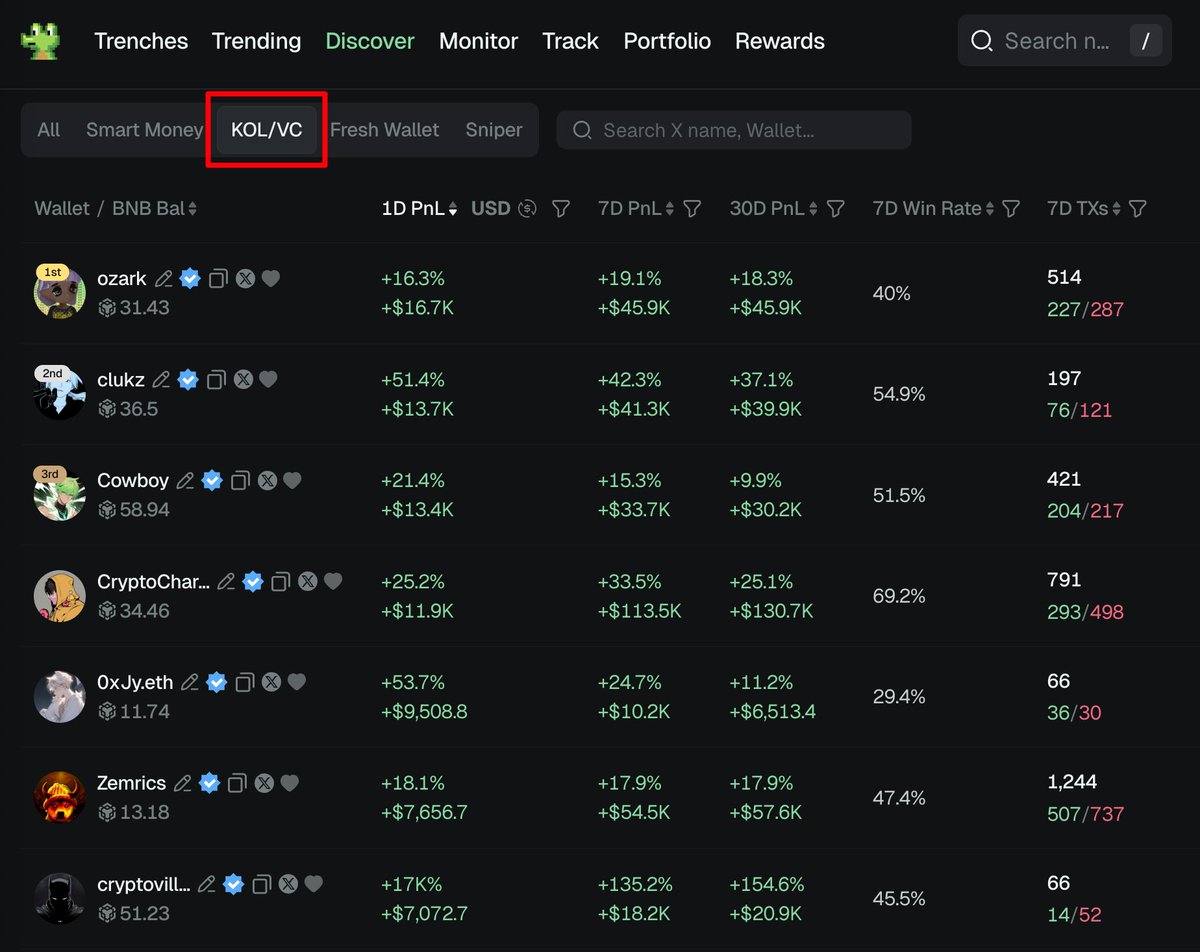 - 点击"BSC Discover - KOL/VC"即可查看KOL中的顶级Degens👇🏻
