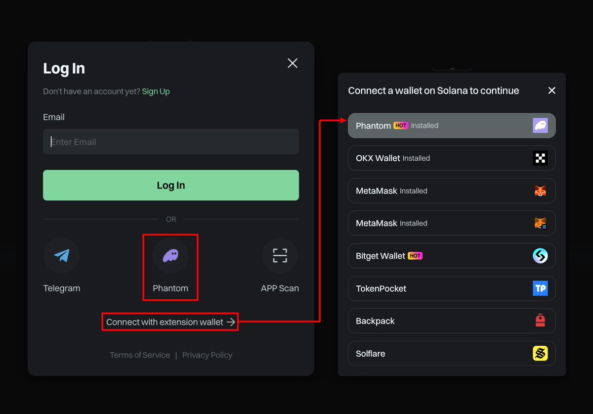 通过扩展钱包连接 - Phantom:直接链接你的 Phantom 钱包进行交易。无法使用 GMGN 自动功能 ❌