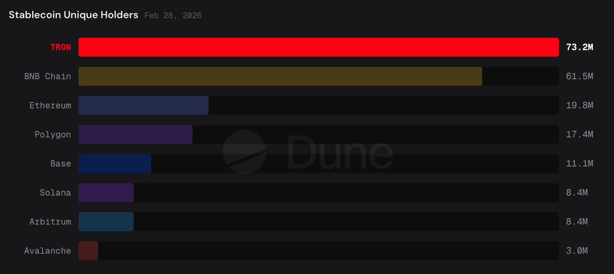 在@trondao上持有稳定币的人数超过任何其他链:7300万且持续增长。加上870亿美元的供应量和约1000万的月度发送者,你开始明白为什么TRON已成为全球稳定币采用的支柱。