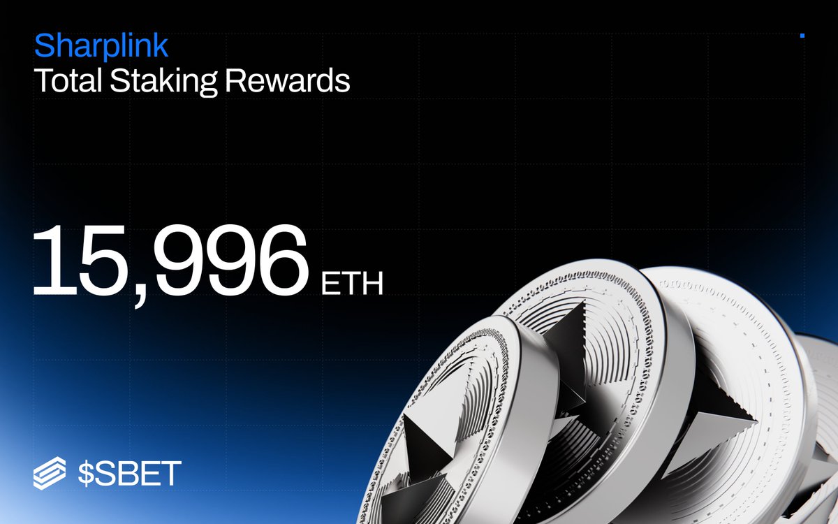 Sharplink现已累计产生15,996 ETH(约$34M)的质押奖励。