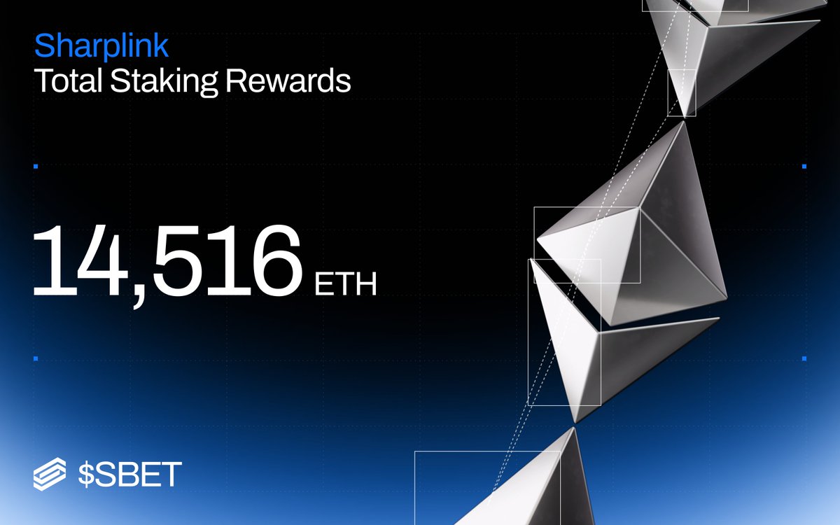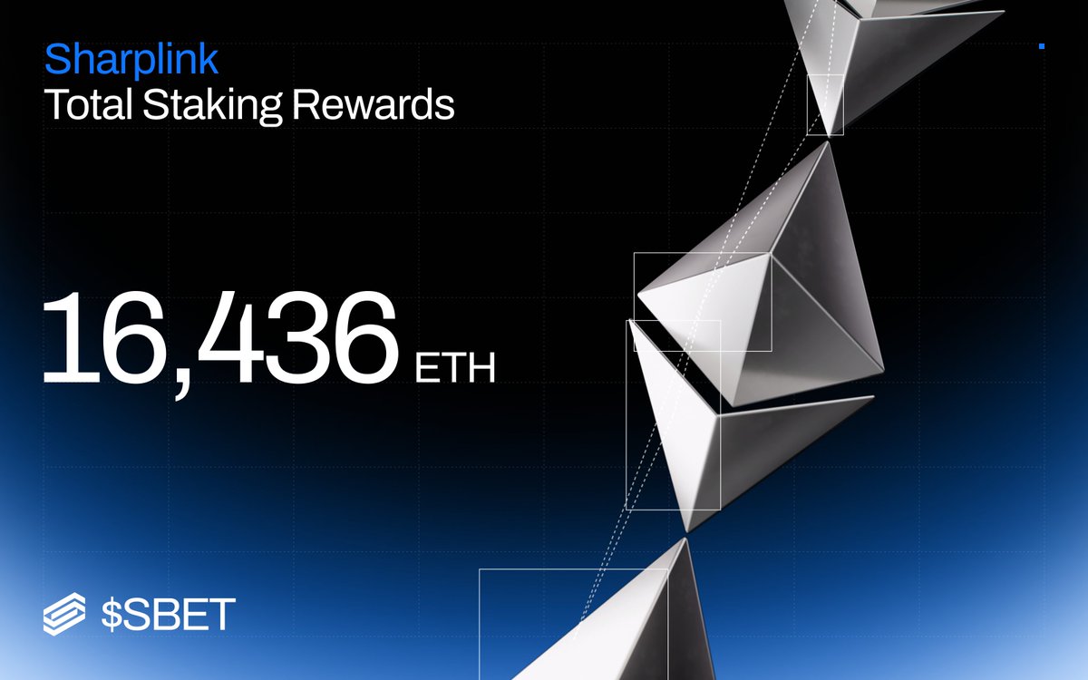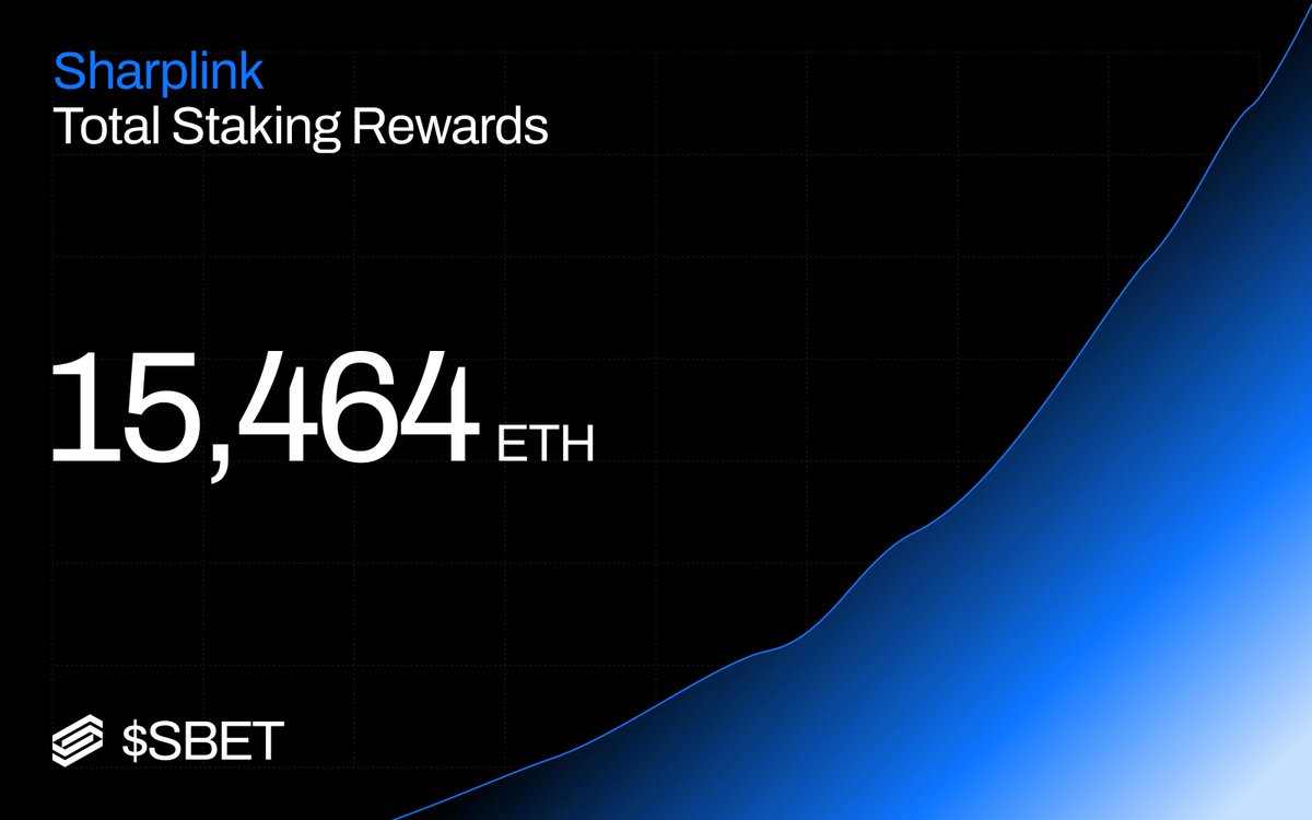 Sharplink现已产生近15,000 ETH(约$30.8 million)的累计质押奖励,自推出我们的以太坊金库以来。几乎100%的ETH都被质押。每天都在复利。这是有优势的以太坊。