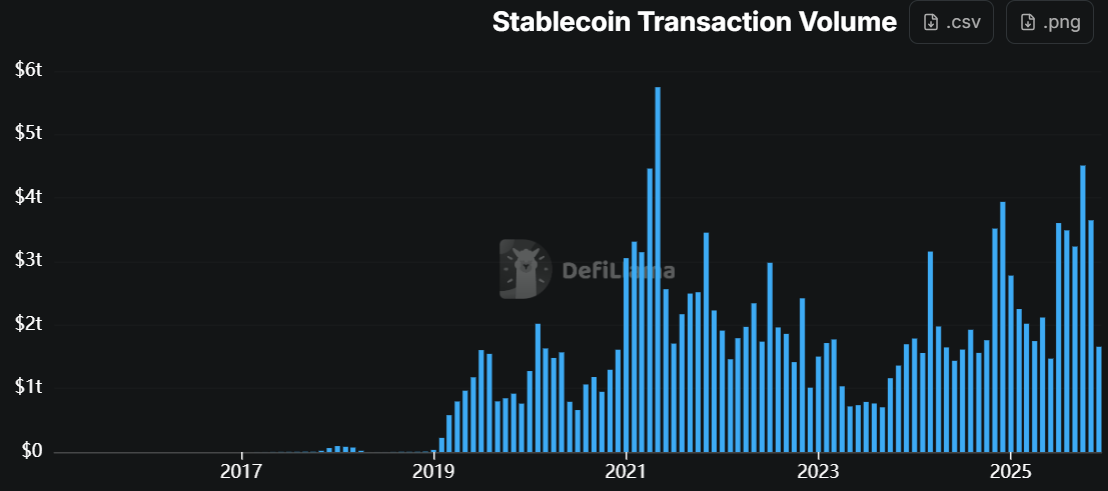 10月份链上交易量达到了多年来的高点,达$4.511万亿。虽然仍低于2021年的峰值,但稳定币自那时以来已经显著成熟。