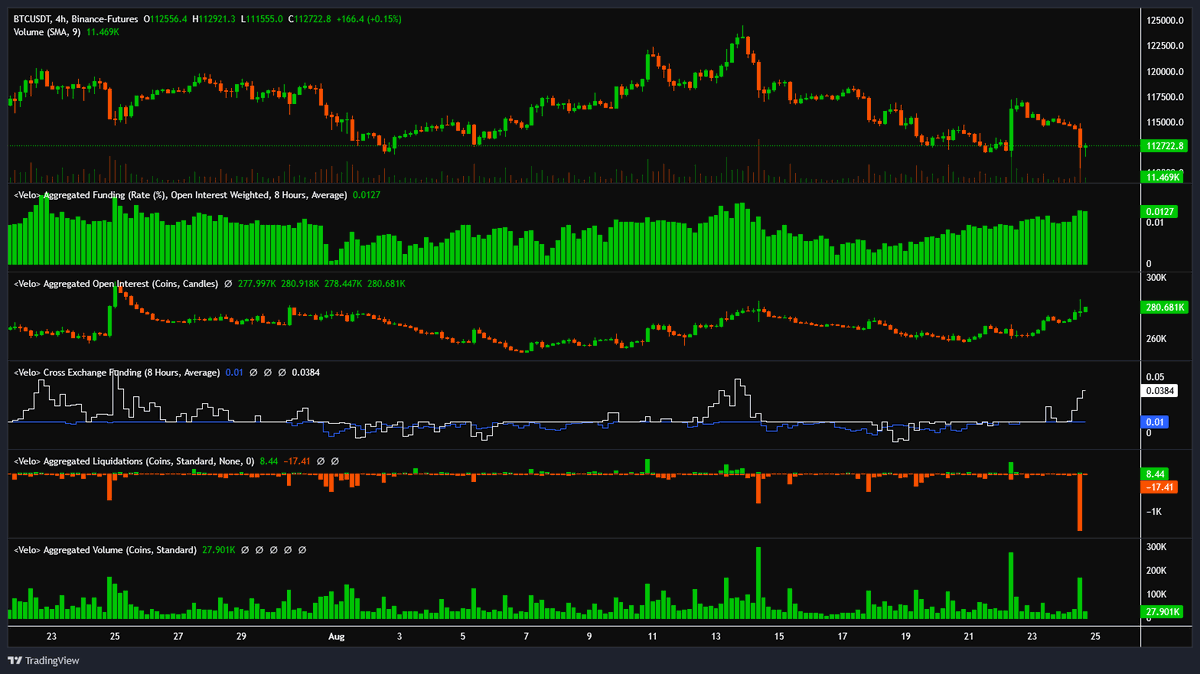 感谢参与。这是市场上周一直试图达成的BTC清算。由人们从BTC转向ETH和SOL引发。一旦短期动能清除且价格突破113.5-114,上涨应该会容易得多。低于Jackson Hole的起点图表已经失效,但仍认为会上涨。