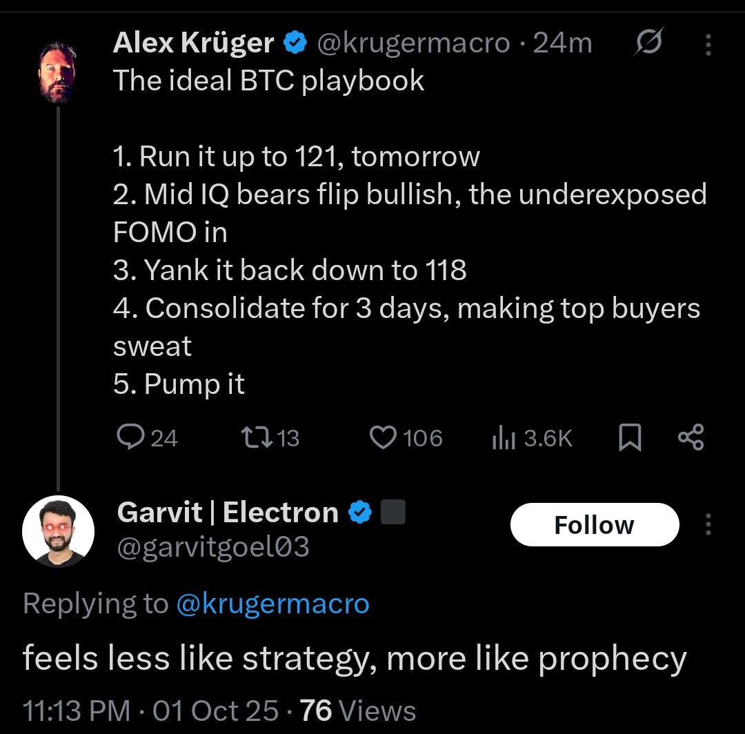 如果120K再次交易,应该预计会有一些杠杆性的清理,而不是将其作为支撑。永远不要把整数位当作支撑,这是新手的行为。这就是为什么本周早些时候我在写的时候,应该在120K以下建仓,以期待突破。