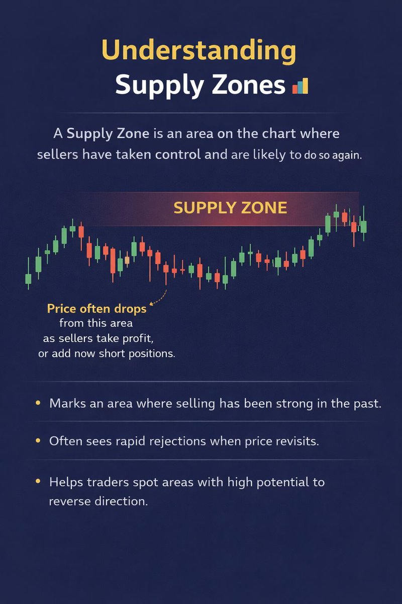供应区域是图表上先前出现卖压并推动价格下跌的区域。由于之前有强劲的卖家在此活跃,交易者通常会密切关注这些水平,如果价格再次回到这些区域。