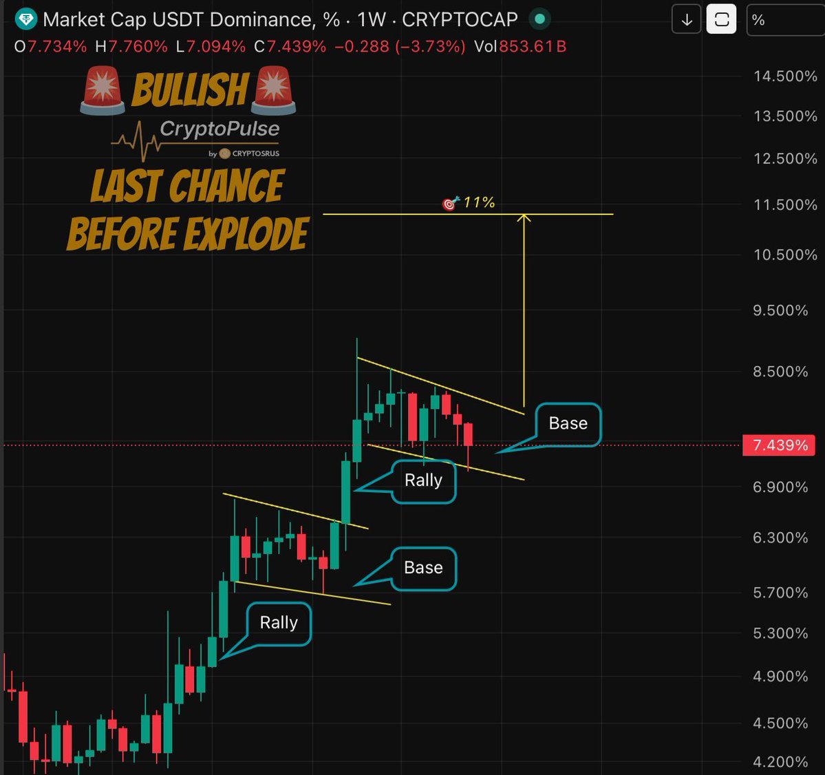 USDT.D明显看涨—反弹-盘整-反弹。当它上涨时,聪明钱正在将资产抛售成USDT。而你还在逢低买入,只是在吸收他们的抛售。