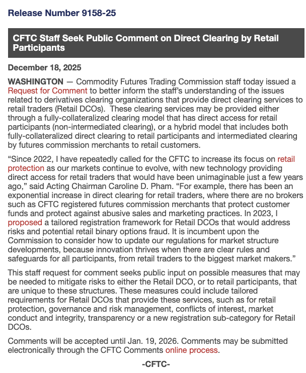 🔸 CFTC寻求反馈,让零售交易者直接参与衍生品清算,这是加强衍生品市场零售保护的一部分。