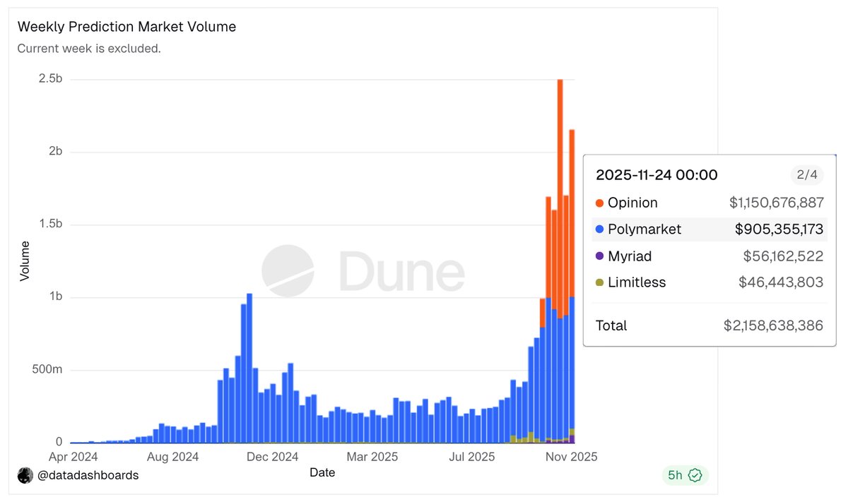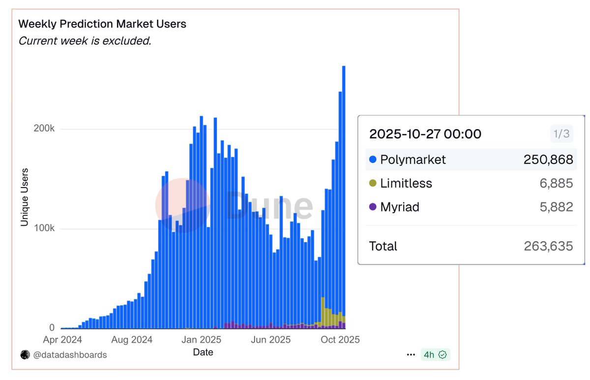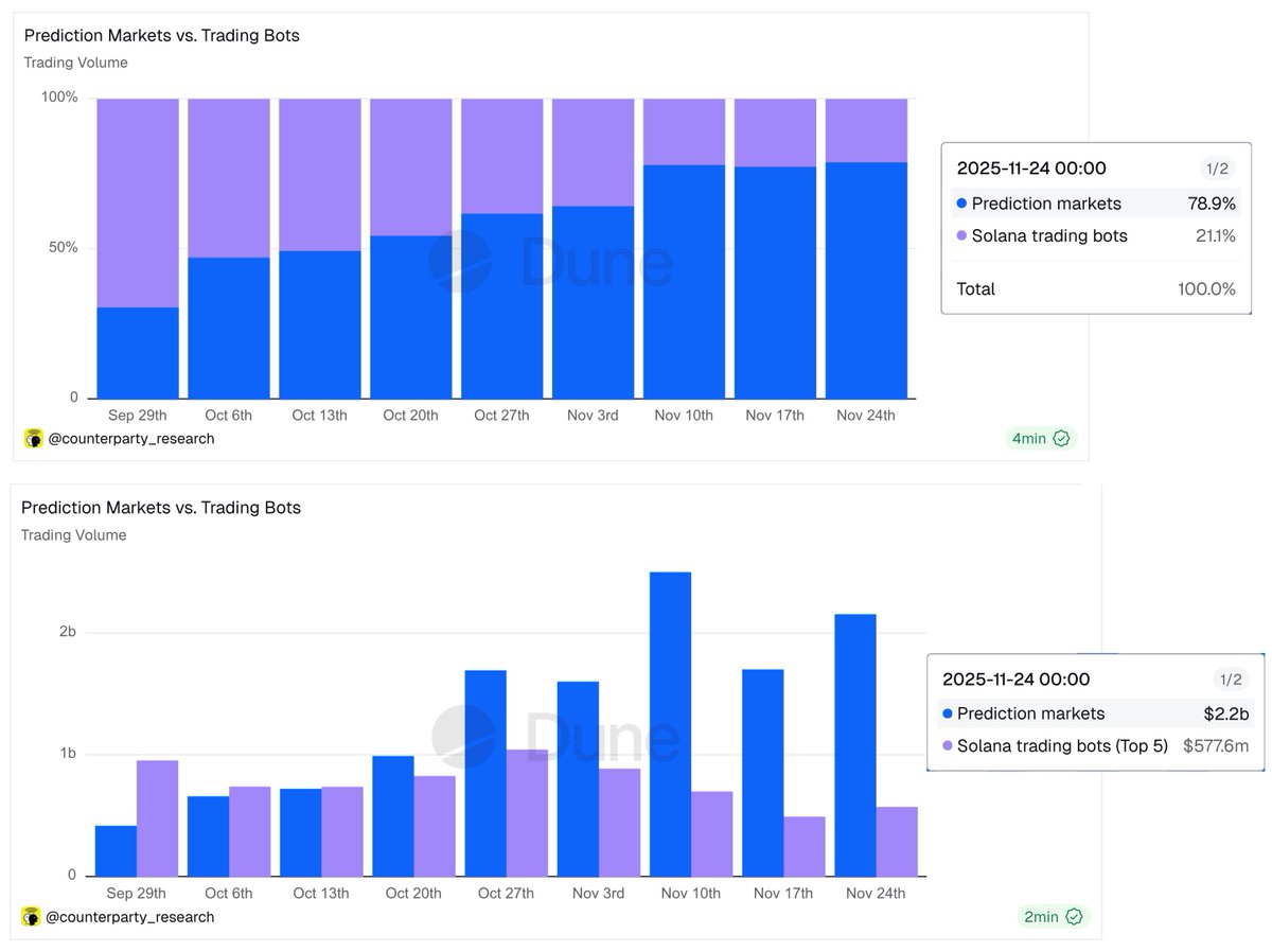 Polymarket, Opinion, Myriad & Limitless上周的交易量几乎是前五大交易机器人的4倍($2.2B vs $578M),用户数量是它们的2倍(294K vs 132K)。