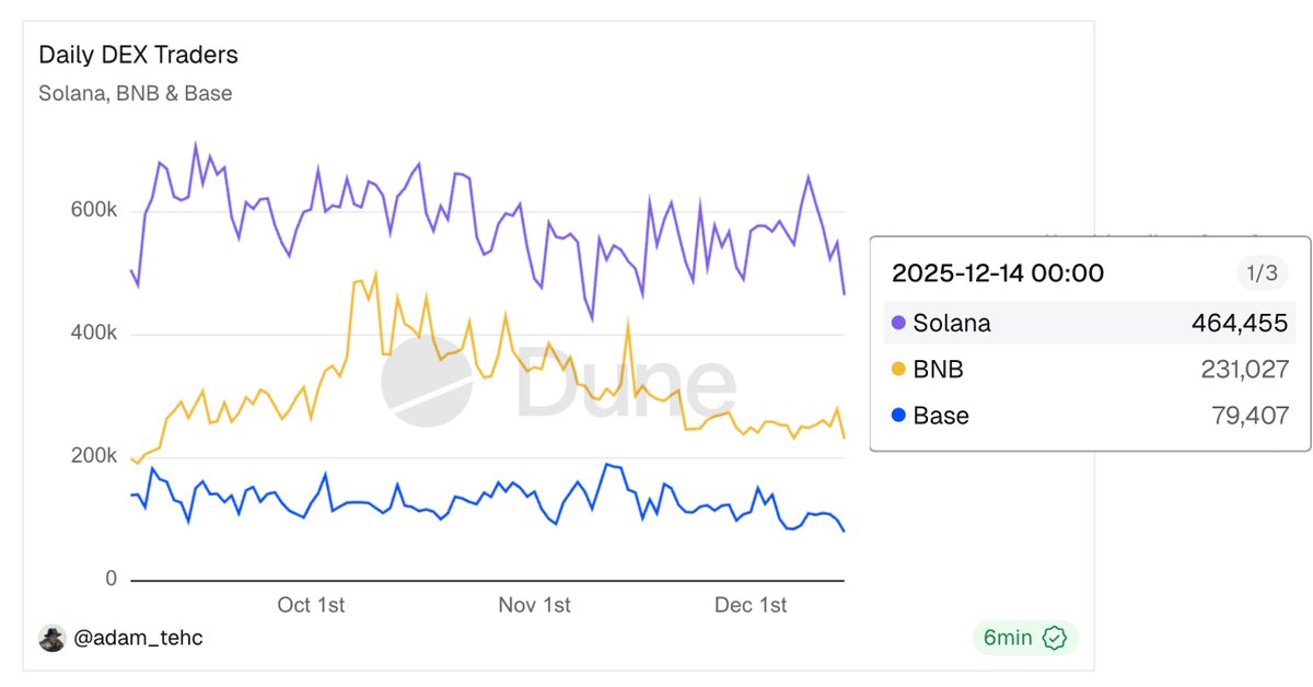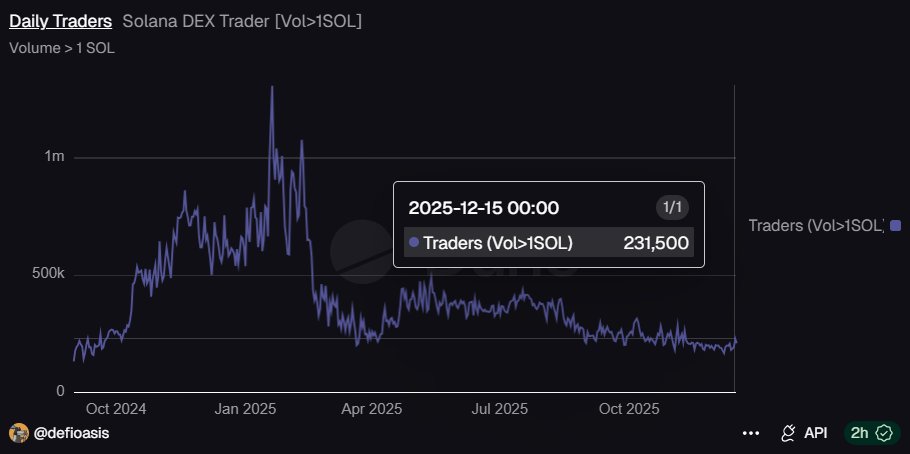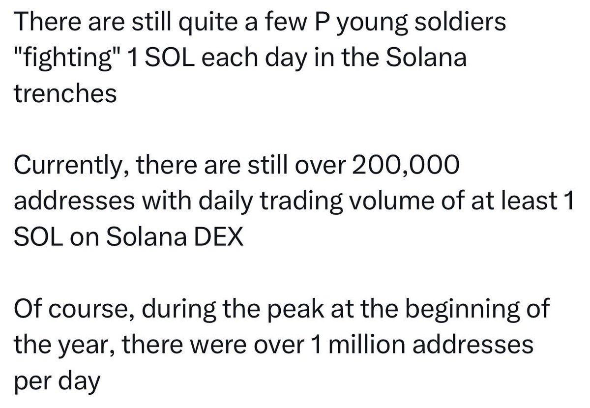 目前每日仍有超过 20 万个地址在 Solana DEX 上的交易量至少超过 1 SOL