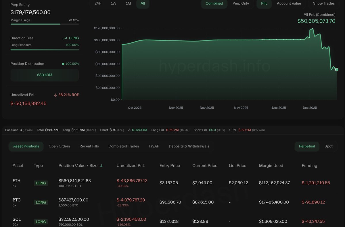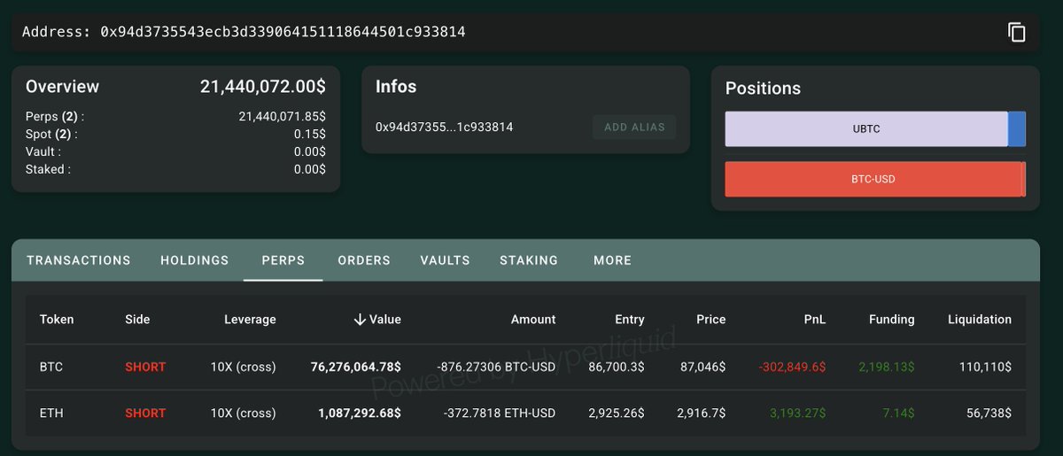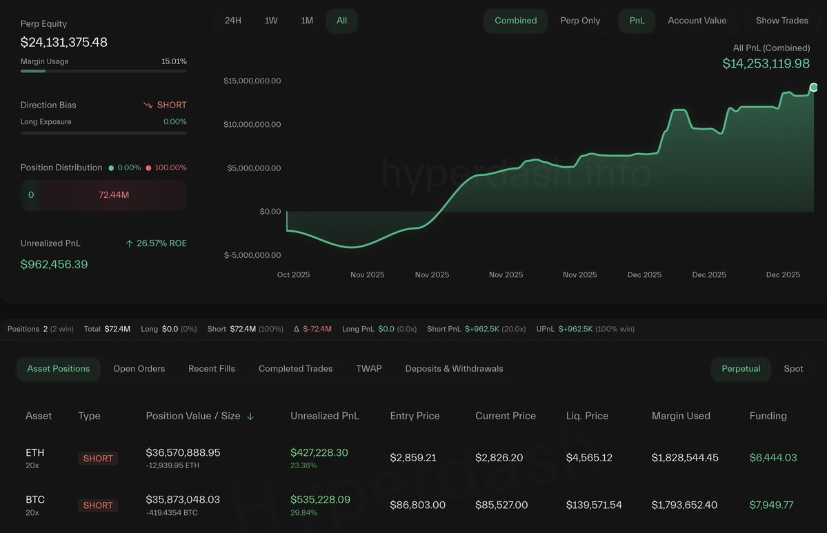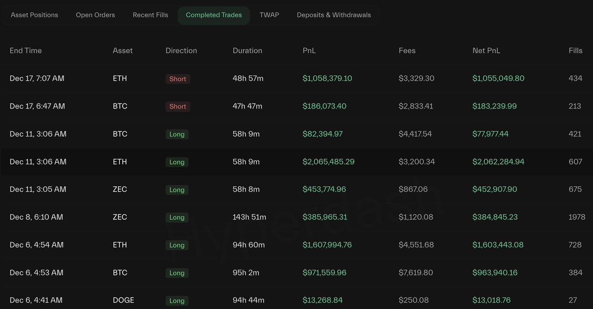 pension-usdt.eth 关闭了他的 $BTC 多头仓位,再次获利 $1.04M,然后转向了 25,000 $ETH($73.98M)的 2 倍空头。自 12 月 8 日以来,他已经连续 12 笔交易盈利,在 HyperLiquid 上的总利润超过了 $25.2M。