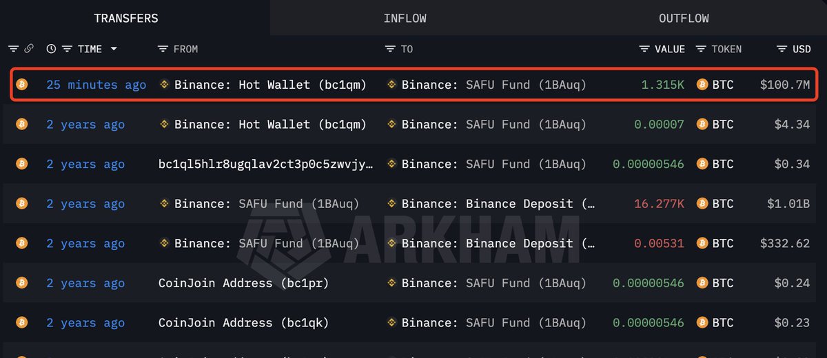 币安SAFU基金刚刚购买了1,315 $BTC($100.7M)。
