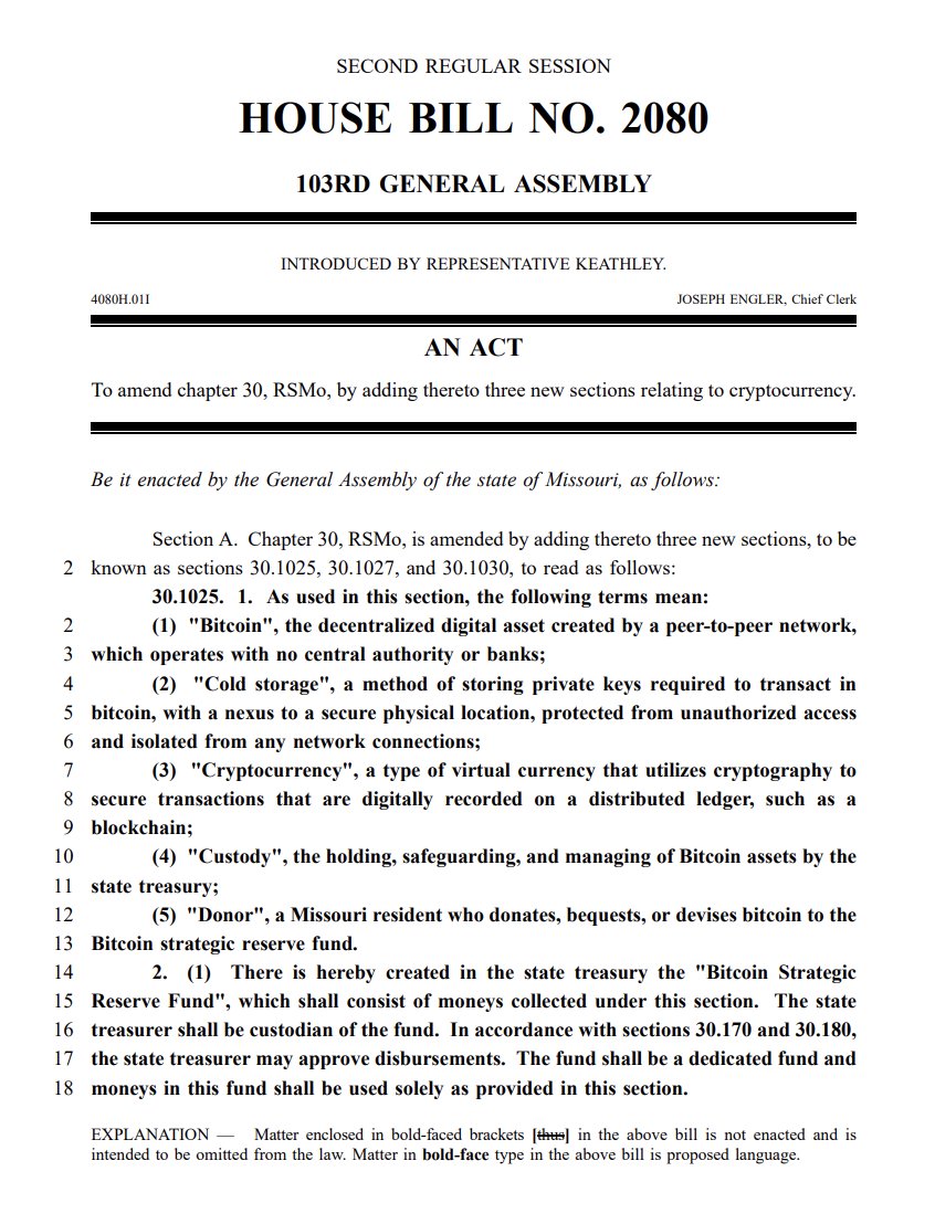 HB2080法案允许该州持有$BTC并接受加密货币缴税,现提交至众议院全体审议。