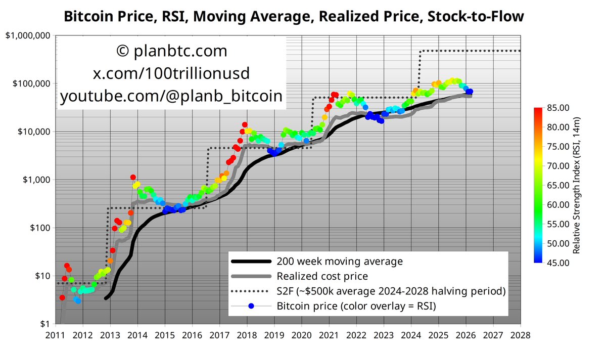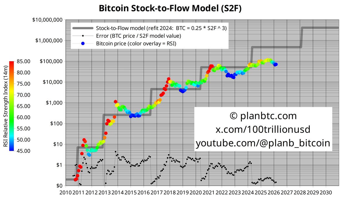 预测:下一阶段(2020–2024,S2F ≈ 56),市场价值约5.5万亿美元 → BTC价格约28.8万美元(基于约1900万供应量)。这显著高于原始模型的约5.5万美元预测。