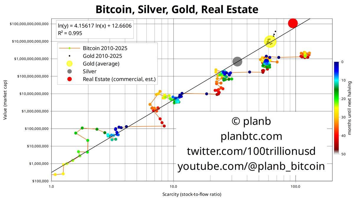 公式:市场价值 = exp(12.76) × (S2F)^4.12(R² = 99.7%,p值极低)。这个单一方程为BTC阶段、白银和黄金定价。