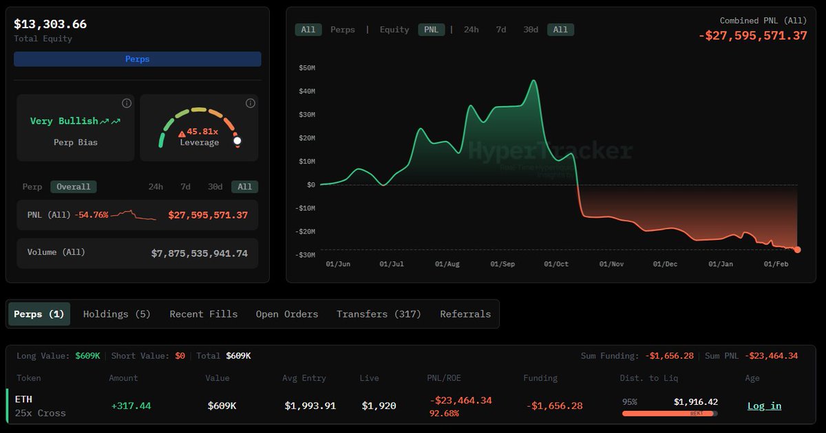 他的亏损现已达到 -$27.56M,距离下一次清算仅差4%。