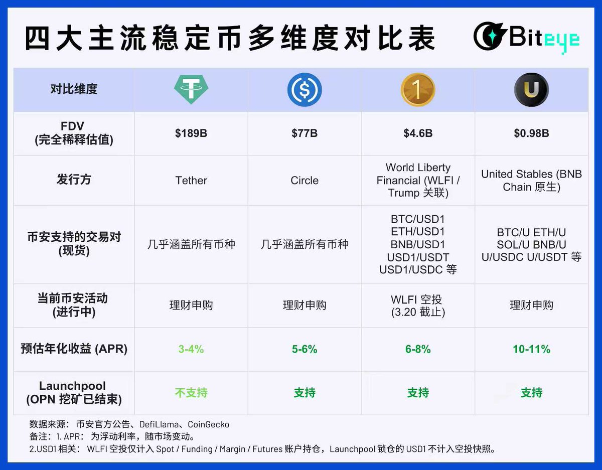 建议大家把USD1、U当做稳定币组合的一部分,比如USDT、USDC、USD1、U分散持有,用USDT/USDC博稳定性,USD1/U博更高收益。
