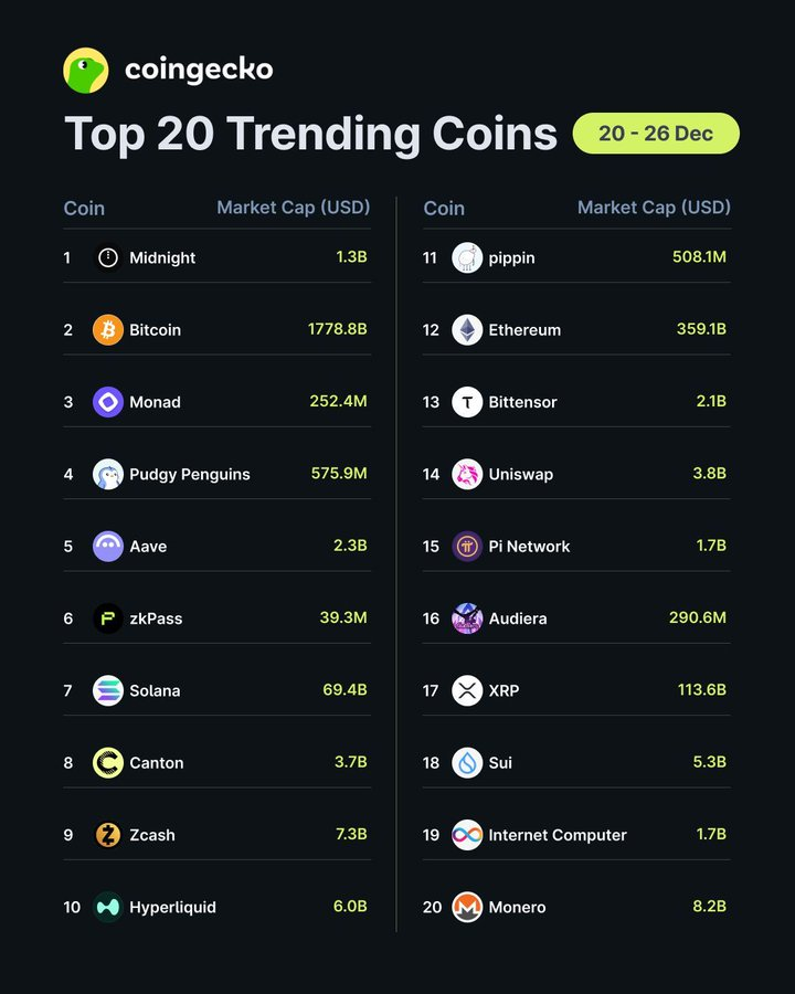 $NIGHT 在CoinGecko的最热门加密货币榜单上名列第一,超过了$BTC、$ETH、$SOL等主要加密货币。