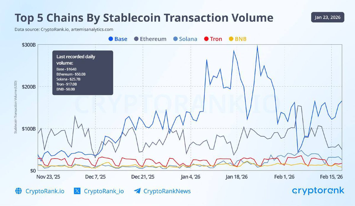 🔥 最新:Base以1640亿美元的日交易量引领所有链的稳定币交易额。