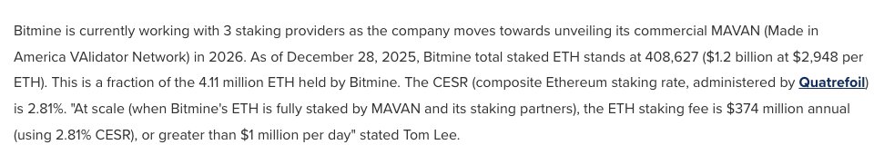 @BitMNR 现在使用CESR(复合以太坊质押率)作为其质押奖励计划“美国制造验证器网络(MAVAN)”的基准。通过以CESR为基准,@fundstrat 预计每天可获得超过100万美元的质押奖励。这是真实的收入,而且这是一个保守的假设。对#CESR来说是个大日子,这是#ethereum质押的权威基准。对管理它的公司@QuatrefoilData来说也是个重要的日子。祝贺Bitmine团队迈出这一重要一步。
