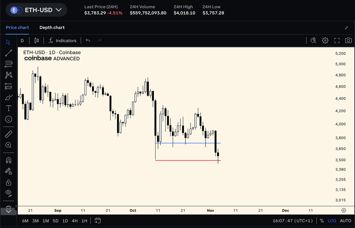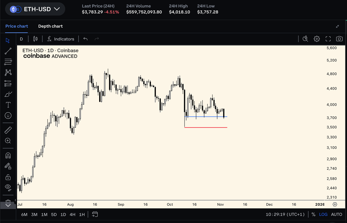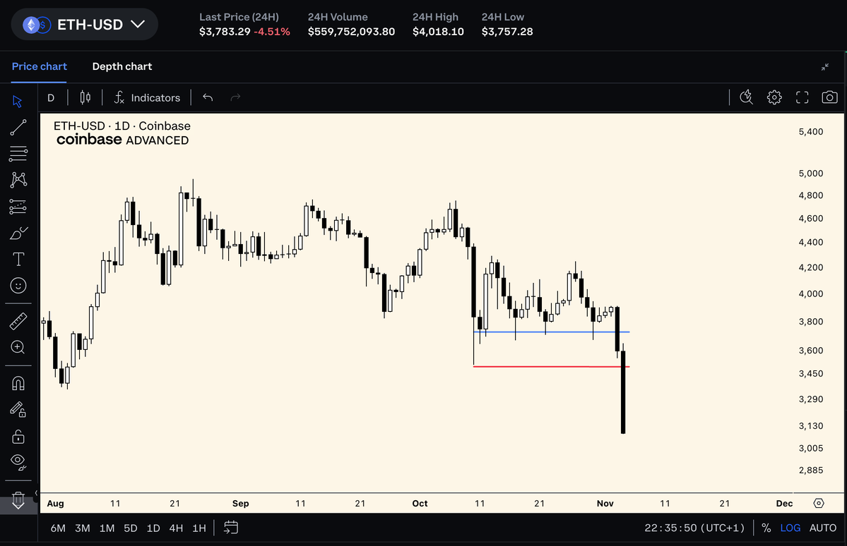 上次ETH出现类似规模的下跌后,它在区间内震荡了12周,然后才反弹至新高。我们现在正处于这个新区间的第6周。只要ETH不跌破$2600,从技术上讲,这是一个*尝试性*的底部形成过程。