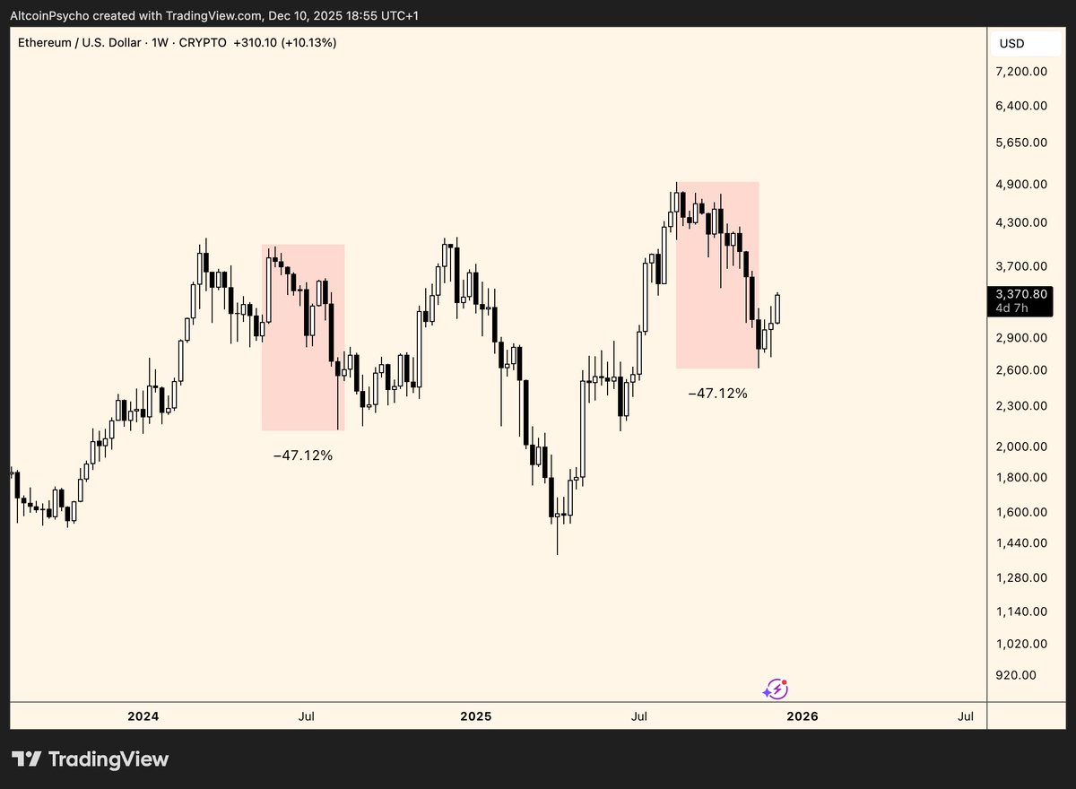 哇... ETH在反弹前刚好跌了47%,就像2024年一样。 (原推文想说的是2024年,不是2025年)