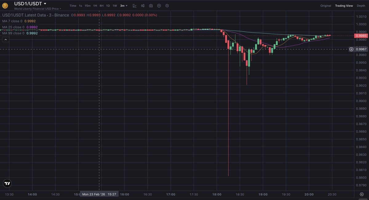 🚨最新消息:@worldlibertyfi 表示在几名WLFI联合创始人的账户被黑客入侵后,其稳定币$USD1遭到协同攻击,并出现了大量$WLFI空头头寸。$USD1在@binance上短暂脱钩至0.98美元,几分钟内恢复至1美元。