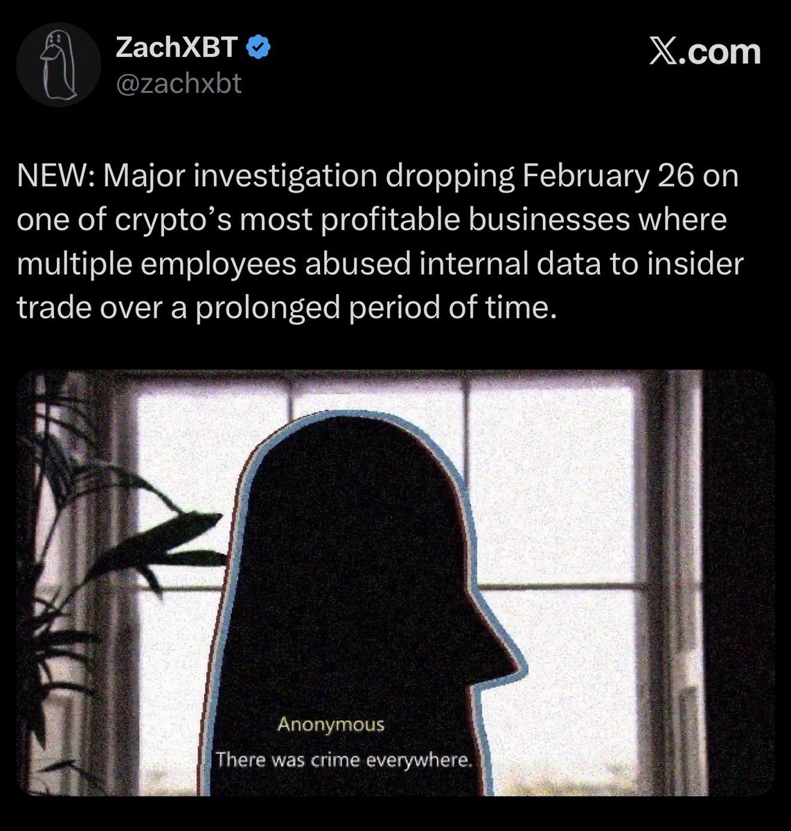 🚨突发新闻:@zachxbt 表示将于2月26日发布一项重大调查,针对加密货币行业最赚钱的企业之一,指控多名员工长期利用内部数据进行内幕交易。