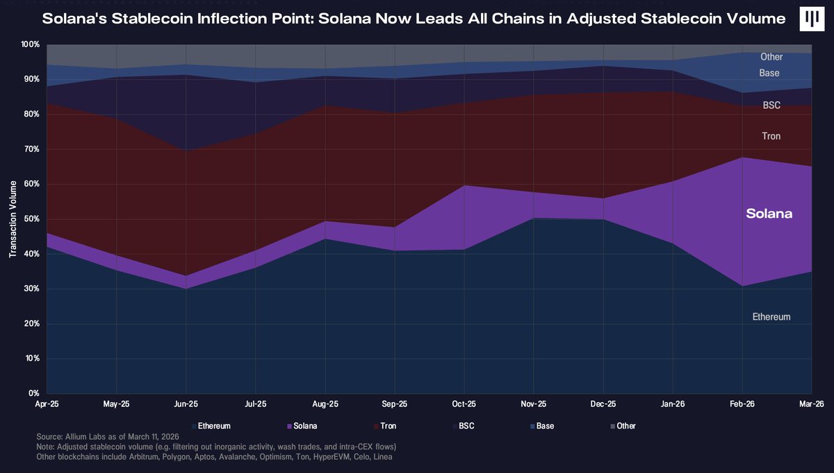 🚨最新消息:根据Allium Labs的数据,@Solana首次在调整后的稳定币交易量方面领先所有区块链,2月份市场份额达到36%,剔除了刷单交易和CEX内部流动。