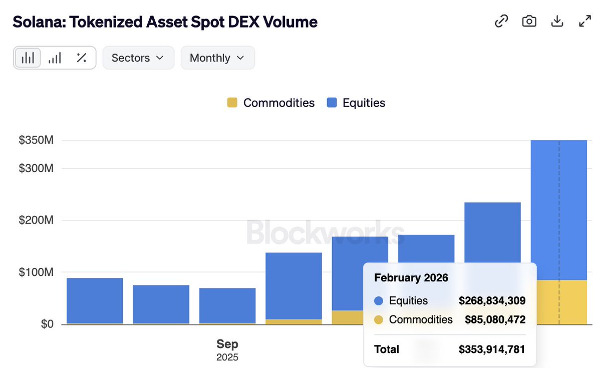 🚨最新:二月,@Solana报告了超过$350M的代币化资产交易量,创下历史新高。