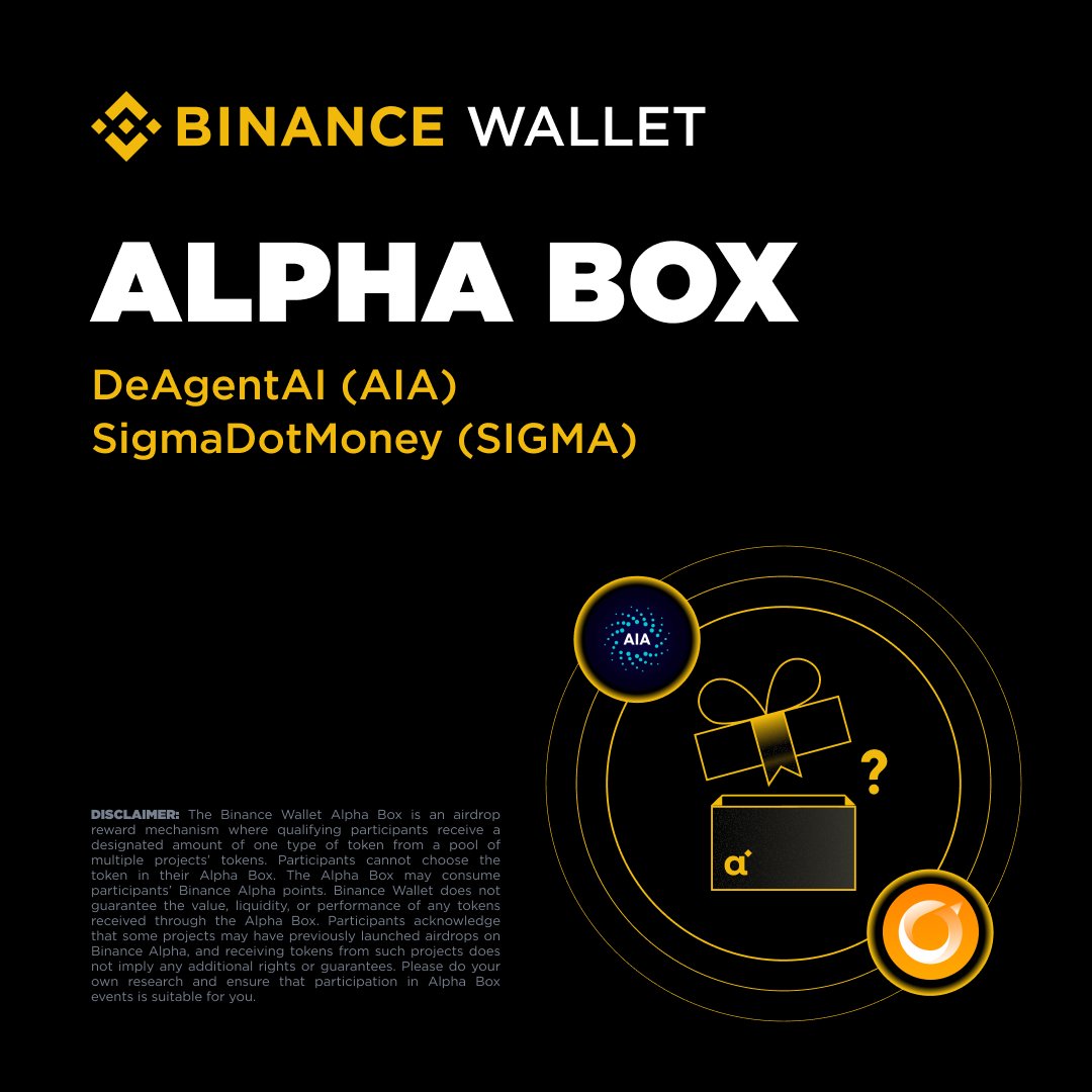 本次活动采用新的Alpha Box模式,空投池包含来自两个项目的代币:DeAgentAI(AIA)和SigmaDotMoney(SIGMA)。持有至少251币安Alpha积分的用户可以在Alpha活动页面领取一次代币空投。领取时,用户将获得以下奖励之一:335 AIA或375 SIGMA。先到先得。