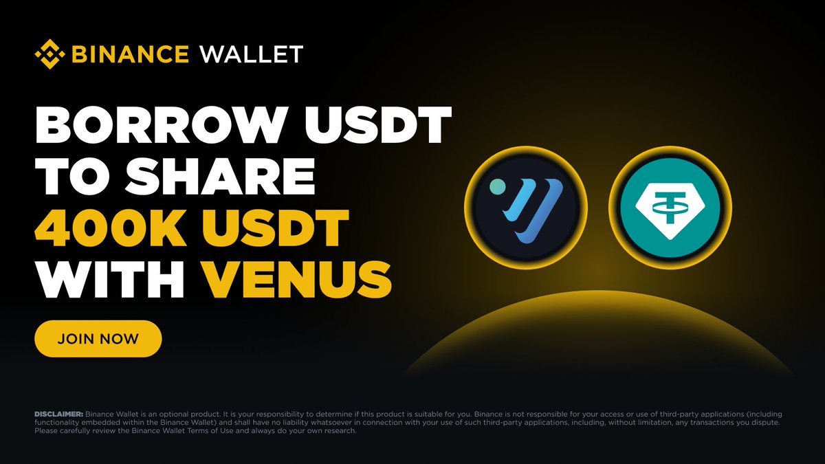 从明天开始,通过在#BinanceWallet中使用@VenusProtocol借入至少100 USDT到BNB链上的Web3 Loan Venus USDT池,分享400,000 USDT奖励池。